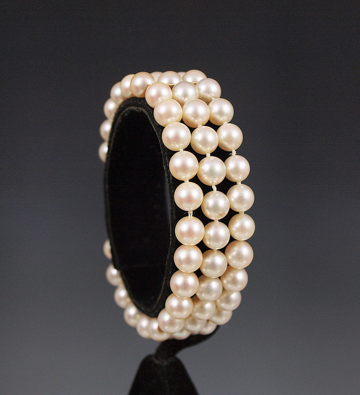 TRIPLE STRAND PEARL & DIAMOND CLASP BRACELET: 14K yellow gold three strand cultured pearl bracelet. 6.00 mm, white with rose' overtone. Slight blemish, high luster. 14K clasp contains 25 round single cut diamonds. Weight: .12 Ct. Approx 14K spacers. Length: 6.5''