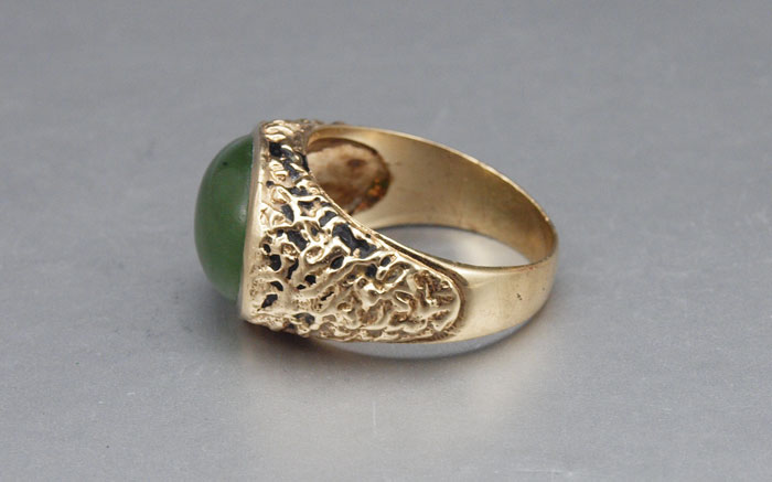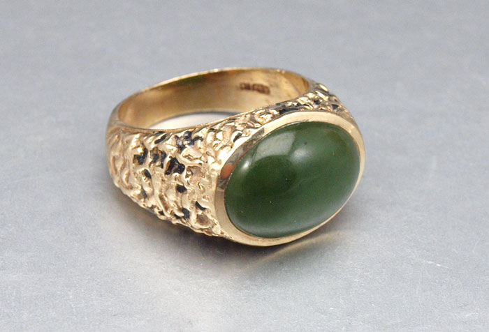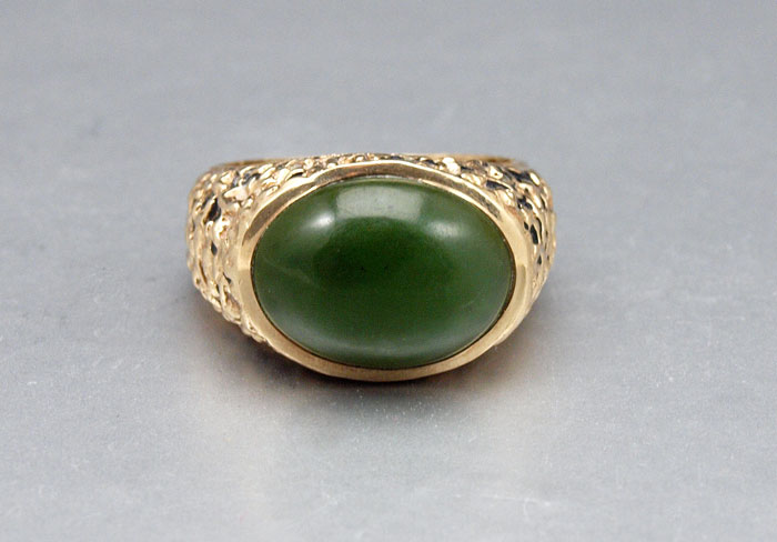 10K NEPHRITE JADE RING: 10K yellow gold nugget ring with oval 16.00 x 12.00 mm nephrite jade. Weight: 10.9 grams. Size: 10