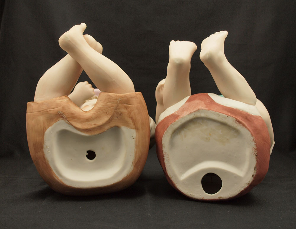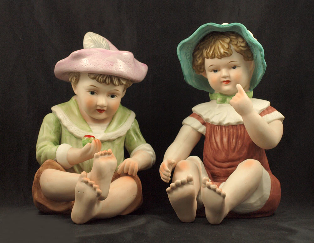 TWO BISQUE PIANO BABIES: 12'' h., boy and girl.