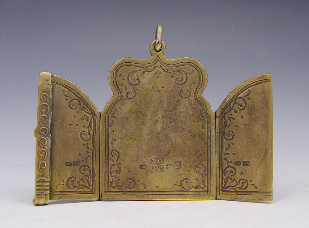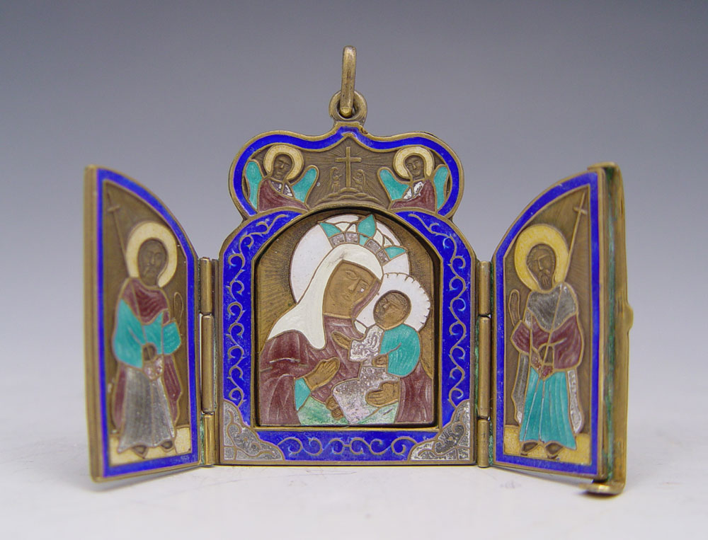 RUSSIAN SILVER ENAMEL TRIPTYCH ICON PENDANT: Scene of Madonna and Child with saints and angels. Unknown maker with Moscow 1880 assay stamp, 84 zolotnik.