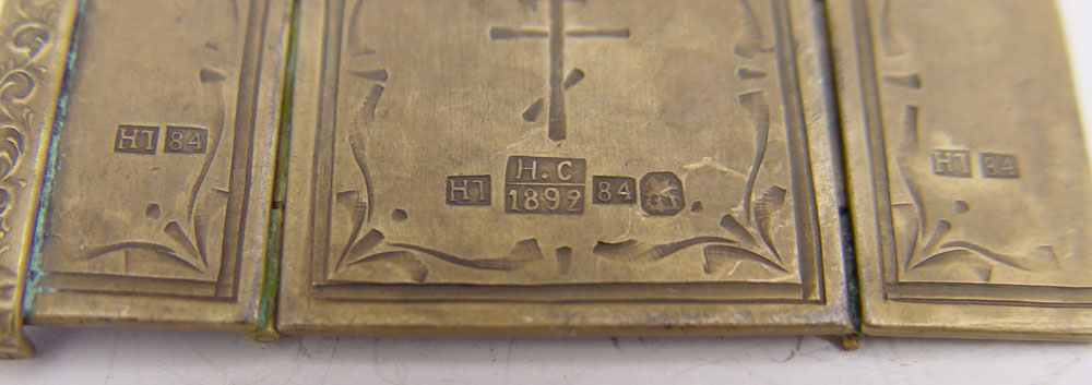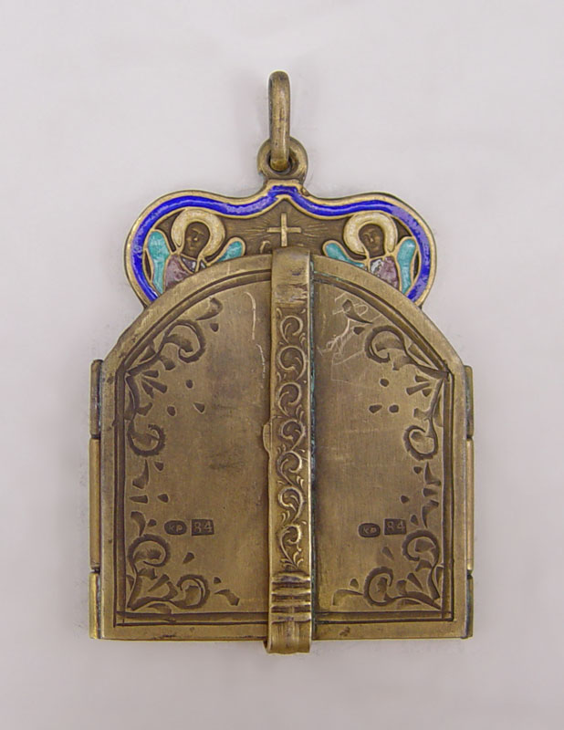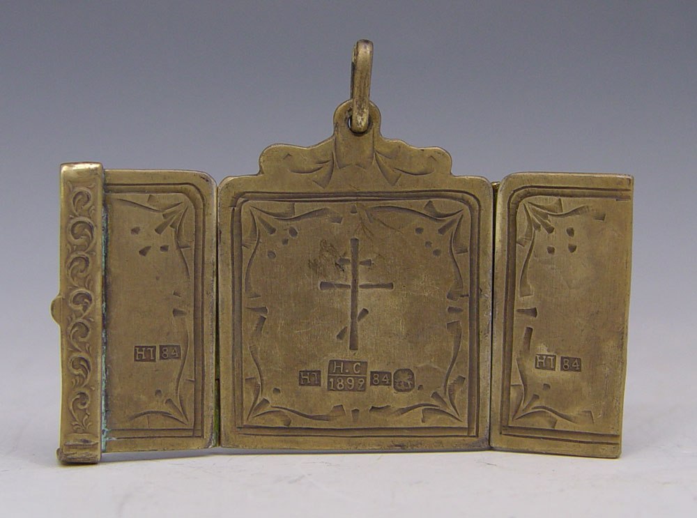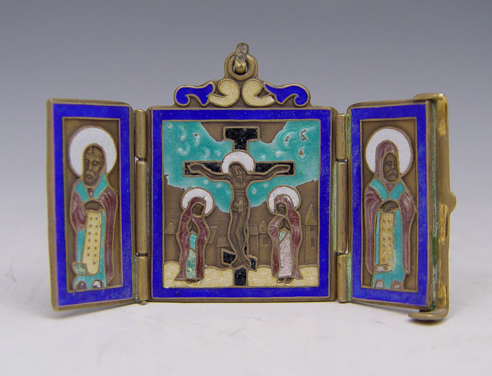 RUSSIAN SILVER ENAMEL TRIPTYCH ICON PENDANT: Scene of Christ on the cross with saints. Unknown maker hallmark with 1892 Moscow assay stamp, 84 zolotnik. 1 1/4'' x 1 1/8''.