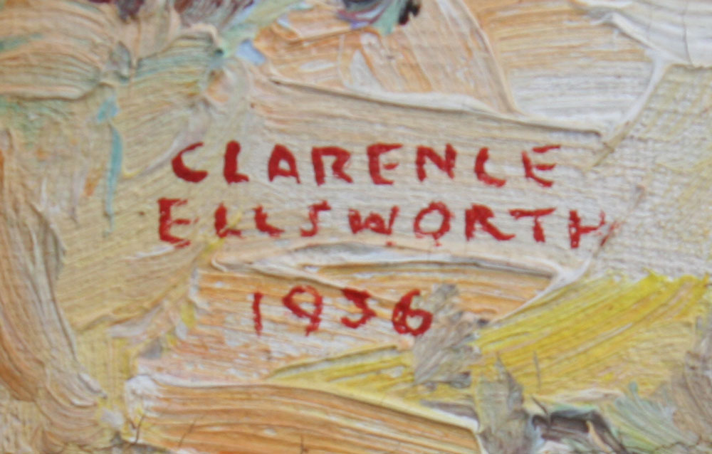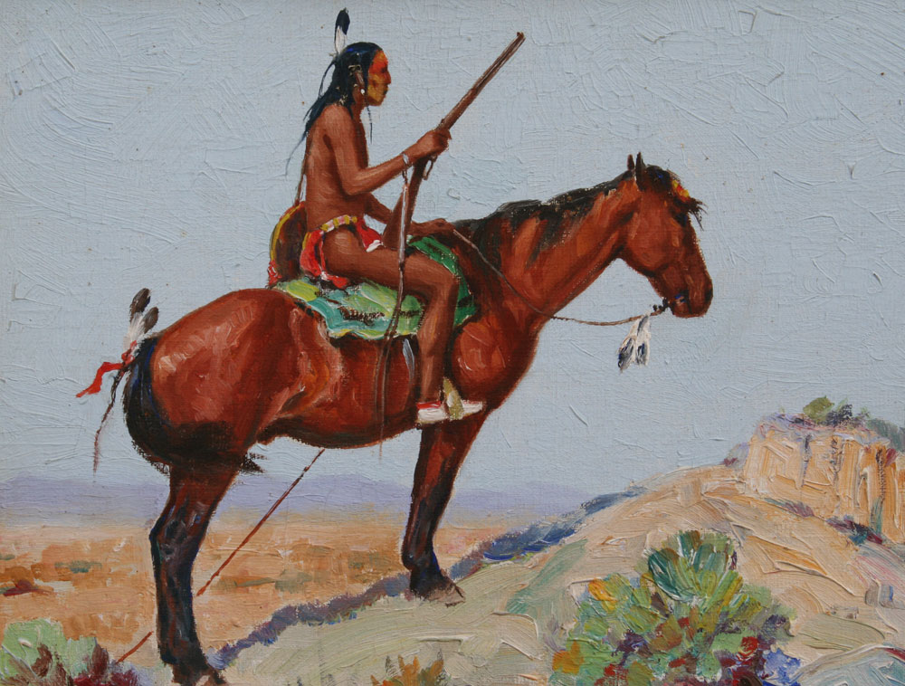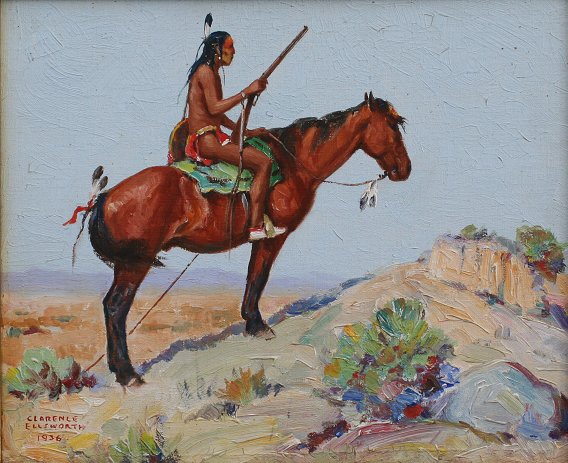 ELLSWORTH, Clarence, (American, 1885-1961): ''Sioux Scout and Costume'', OIL/Canvasboard, 10'' x 12'', signed & dated 1936, period carved and gilded impressionist frame, 12 1/4'' x 13 1/4'', titled verso.