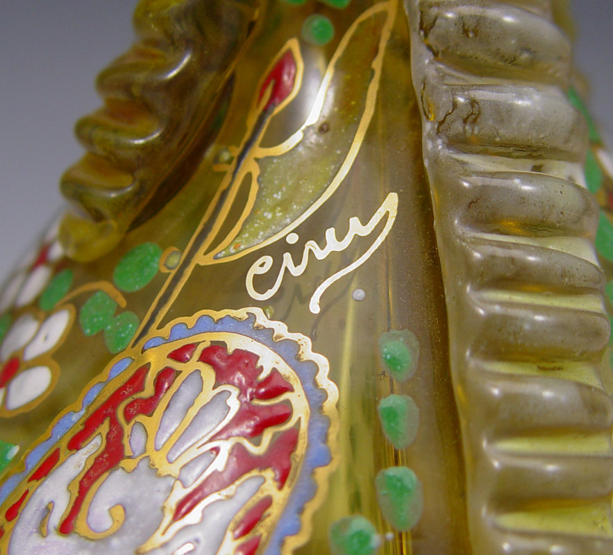 MOSER TYPE ENAMEL DECORATED DOUBLE SPOUT DECANTER: 9'' tall.
