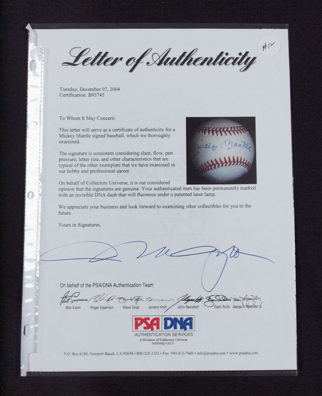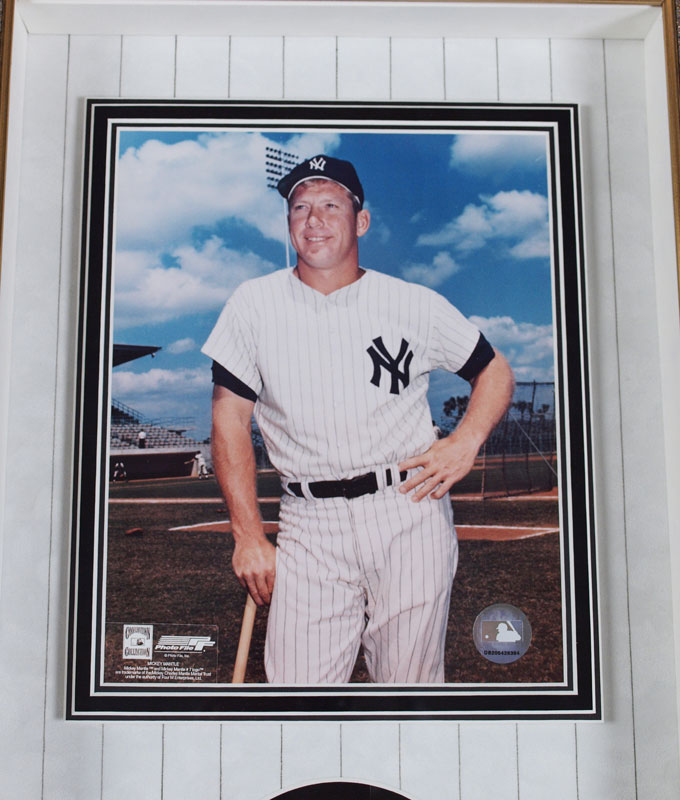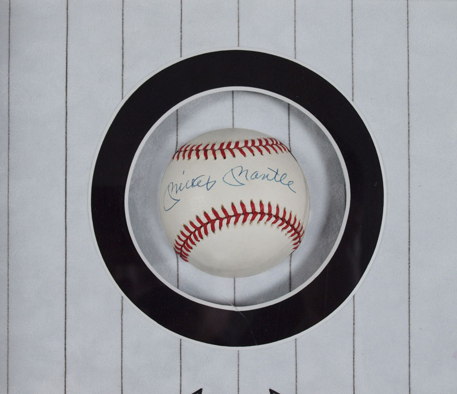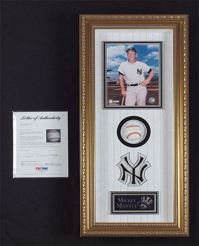MICKEY MANTLE SIGNED BALL IN SHADOW BOX FRAME: Framed with photo and plaque with Yankees motif. Sold with PSA / DNA certificate. Frame 35'' x 16'' x 5''