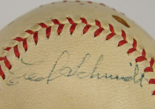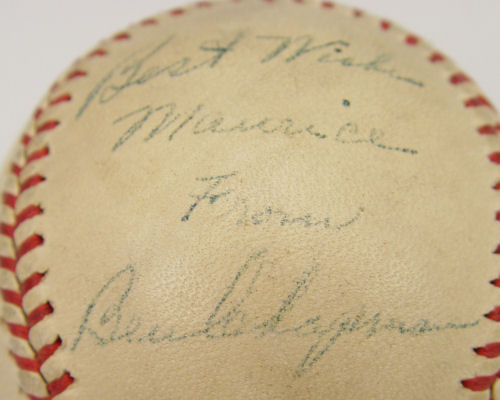 BEN CHAPMAN & FRED SCHMIDT PHILLIES SIGNED BASEBALL: Circa 1947, signed in blue pen '' Best Wishes Maurice from Ben Chapman. Also signed by Fred Schmidt, a pitcher on the 1947 Phillies. A note from the consignor states ''The baseball was given to my Grandfather, Maurice Bloch, who I believe was owner of the Selma Cloverleafs baseball team, (in Selma Alabama) of the Southeastern League in the 1940's. The team played at Bloch Park (formerly Roswell Field) in Selma. The Baseball is signed by Ben Chapman, one of the managers of the Philadelphia Phillies in 1947, and by Freddy Schmidt, who played with the Phillies on the 1947 team. Schmidt was a player on the St. Louis Cardinals Team which went to the World Series in 1944. Schmidt left the Phillies and was traded to Chicago Cubs later in 1947.''