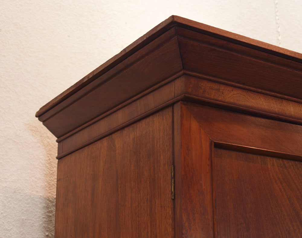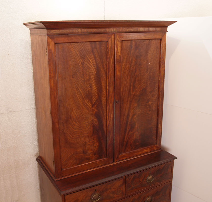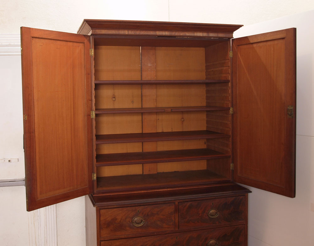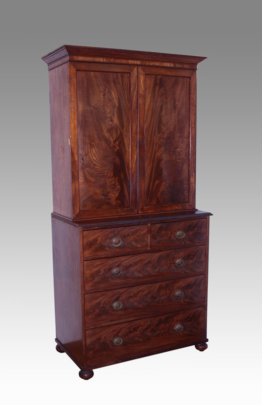 LATE 19TH CENTURY LINEN PRESS: 2 single panel upper doors with 4 interior adjustable shelves, removable cornice base with two over three drawers. Original oval brass pulls and bun feet. Overall approx. 85 1/2''h. x 41 1/4''w. x 17''d.