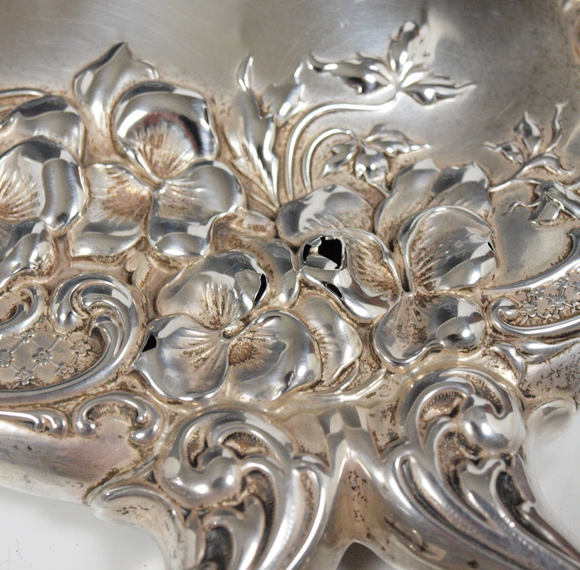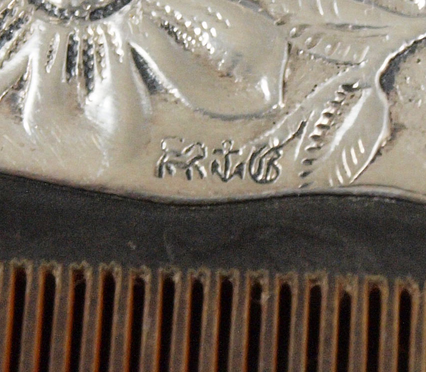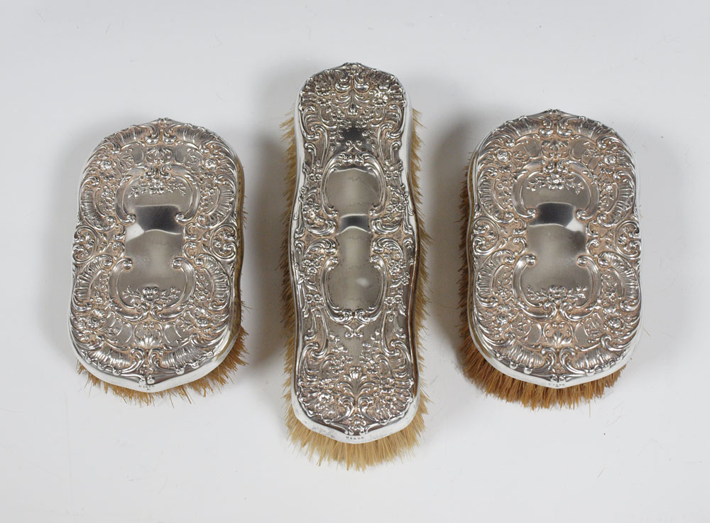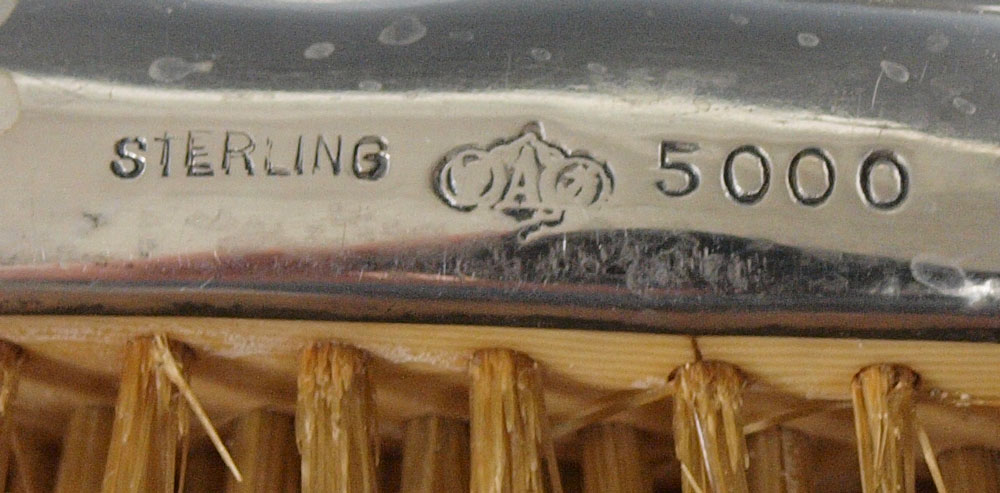STERLING DRESSER BOXES, MIRRORS, AND BRUSHES: To include 1) 2 Gorham hand brushes 1 3/4'' x 3 1/8'' x 5 1/8''. 2) Gorham bar brush 2'' x 7'' x 2 1/2''. 3) Gorham hand mirror 9 5/8'' x 5 1/2''. 4) Gorham comb with faux tortoise shell teeth, note missing teeth. 5) Alvin handled brush, monogrammed, 1 3/4'' x 9'' x 2 7/8''. 6) Alvin hand mirror, monogrammed, 7 3/8'' x 5 1/2'', note multiple dings. 7) Gorham lid only to dresser jar 1 7/8'' x 3 1/2'' dia. 8) Unknown maker lid only 3/4'' x 1 1/2''. 9) Pair unknown maker cut glass dresser jars, monogrammed 2'' x 2'' dia.