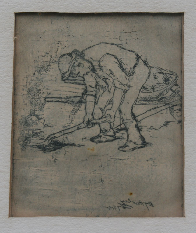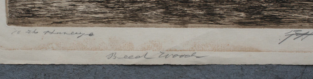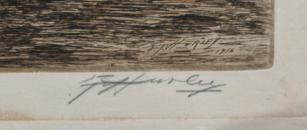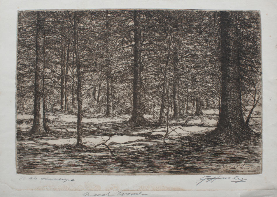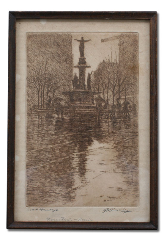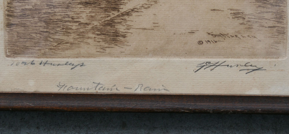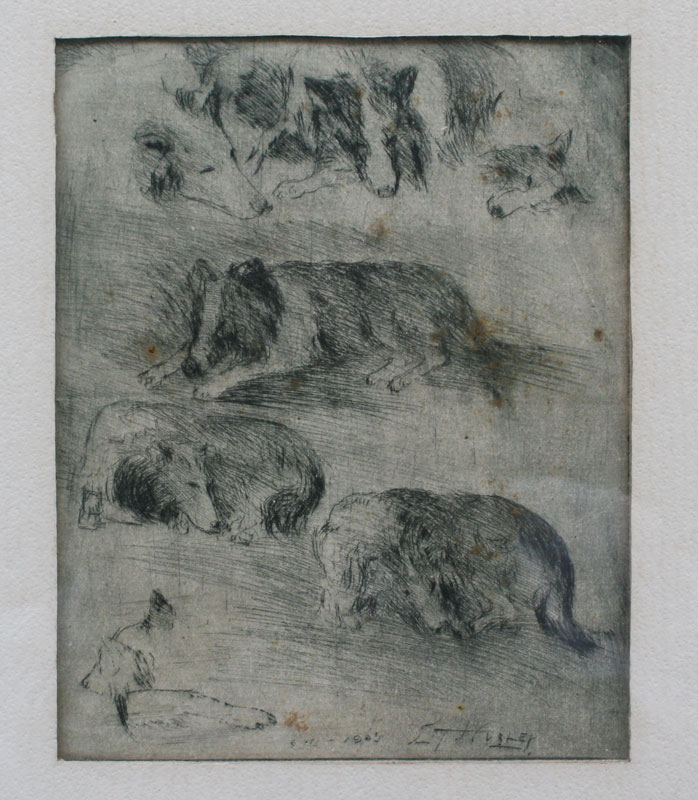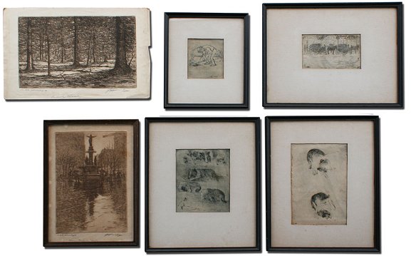HURLEY, Edward Timothy, (American, 1869-1950): 6 Etchings; (1) Beachwoods Etching Dedicated to the Hurleys, signed Hurley in lower right, unframed, fullsize with margins 10 1/4'' x 14 3/4'', signed and dated in the plate 1916. (2) Worker Digging, sight size 4 1/2'' x 3 3/4'', framed, 10 1/2'' x 9''. (3) Street Scene with Figures, sight size 3 3/4'' x 6'', framed, 12'' x 14 3/4''. (4) Two Collie Studies, 5 3/4'' x 8 1/2'', signed and dated in the plate 1905, framed, 11 3/4'' x 15''. (5) Several Studies of Collies, sight size 7'' x 5 1/2'', signed and dated in the plate 1905. (6) ''Fountain Rain'', dedicated to the Hurleys, signed Hurley in pencil in the lower right, also signed and dated in the plate 1916, fullsize with margins 12 1/2'' x 8 1/2'', framed 13 1/2'' x 9 1/2''.