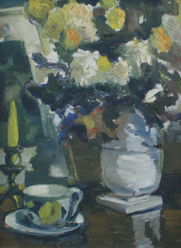 EXCELLENT IMPRESSIONIST OIL/CANVASBOARD STILL LIFE WITH FLOWERS AND TEACUP: From the Hurley Family Collection, OIL/Canvasboard, 16'' x 12'', no visible signature, framed, 21 1/2'' x 17 1/2''.