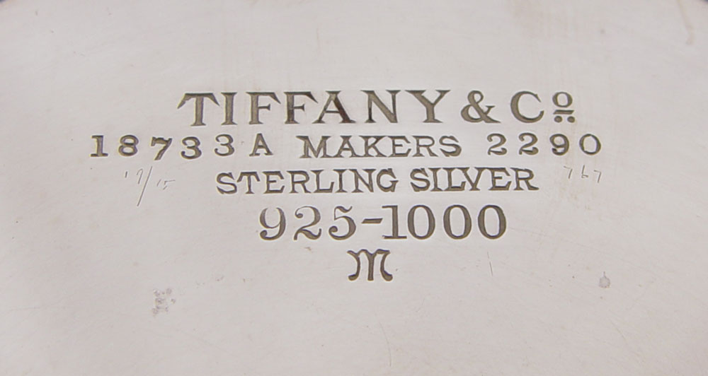 TIFFANY & CO. SQUARE STERLING PEDESTAL SALVER: Embossed floral design corners, with engraved center medallion, monogrammed. 1 3/8'' h. x 10 1/2'' square. Approx. 18.8 troy oz.