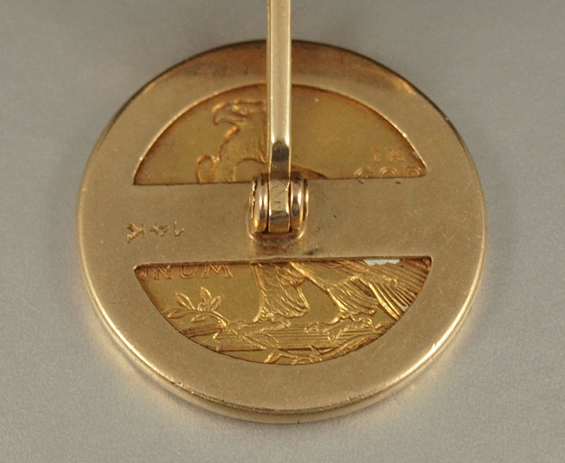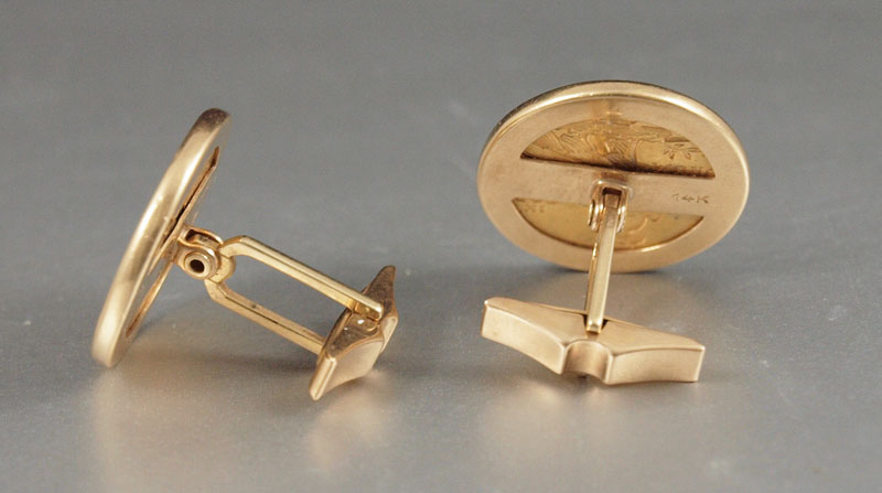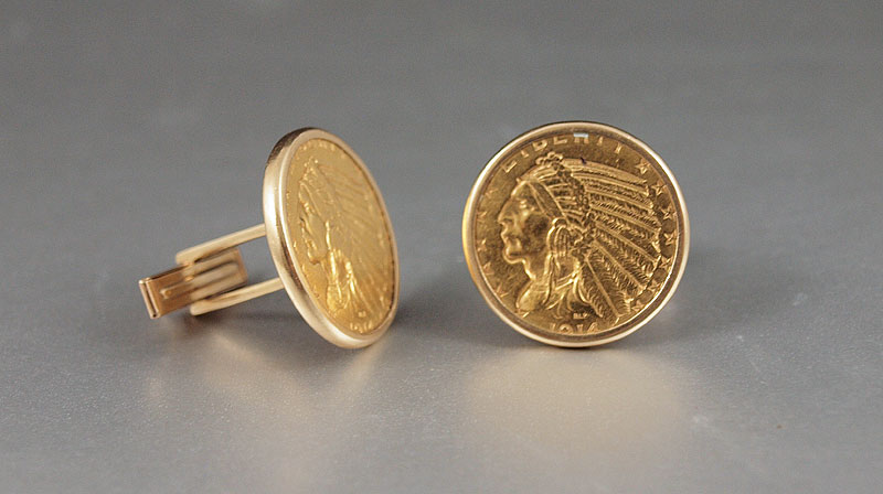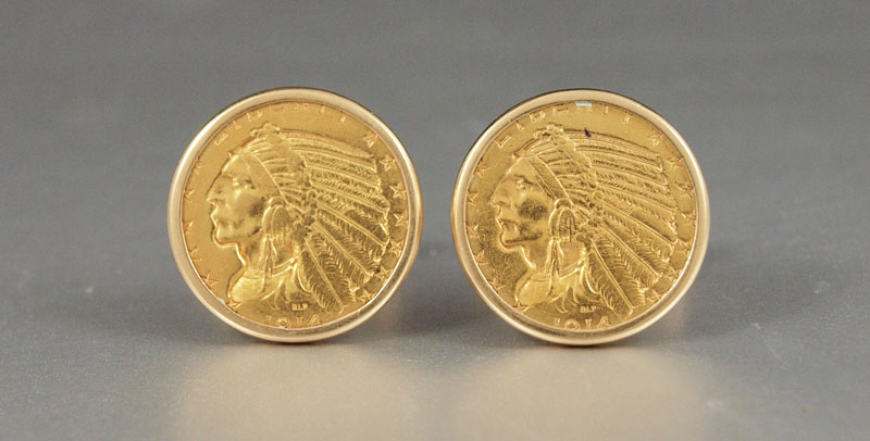 GOLD CUFF LINKS WITH 1914 GOLD INDIAN HEAD HALF EAGLE COINS: 14K yellow gold cufflinks contain two 1924 US Indian Head $2.50 gold coins. Approx. 23.6 grams.