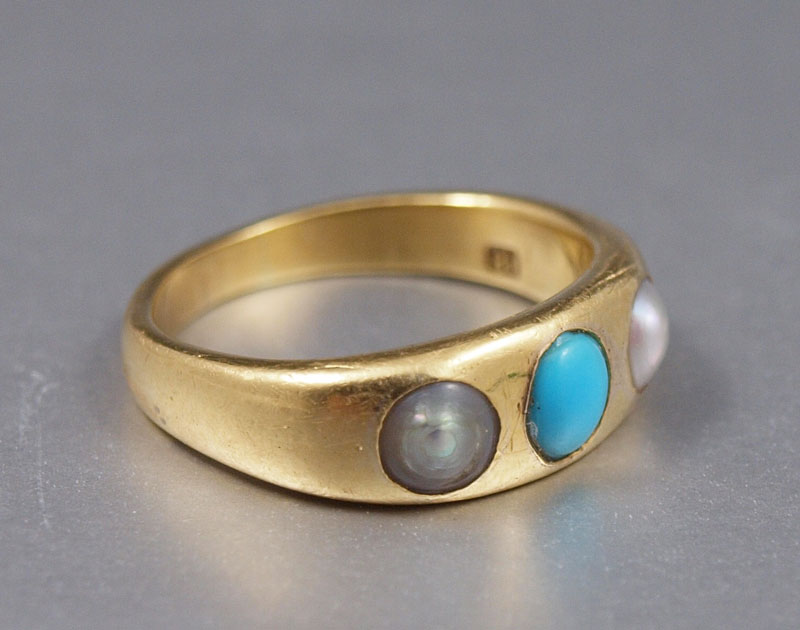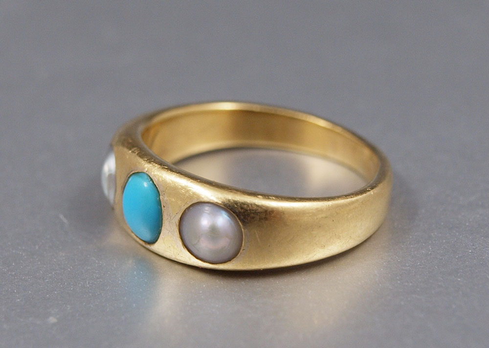 18K VICTORIAN PEARL & TURQUOISE RING: 18K yellow gold ring contains two 4.00 mm half seed pearls. The pearls are worn. One 4.00 mm cabochon cut piece of turquoise. The pearls and turquoise are prong set. Weight: 5.5 grams. Size: 5.5