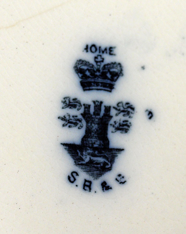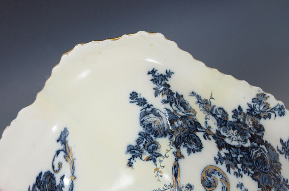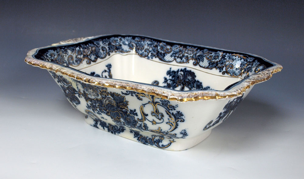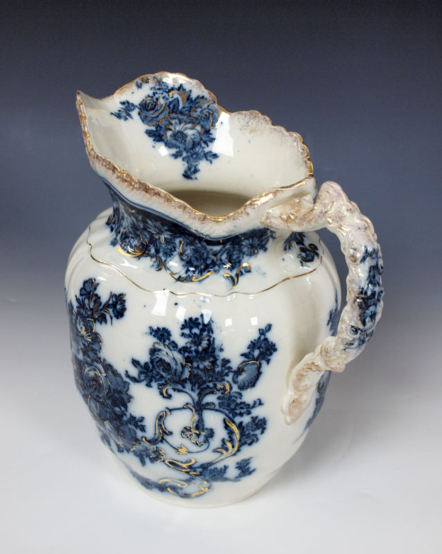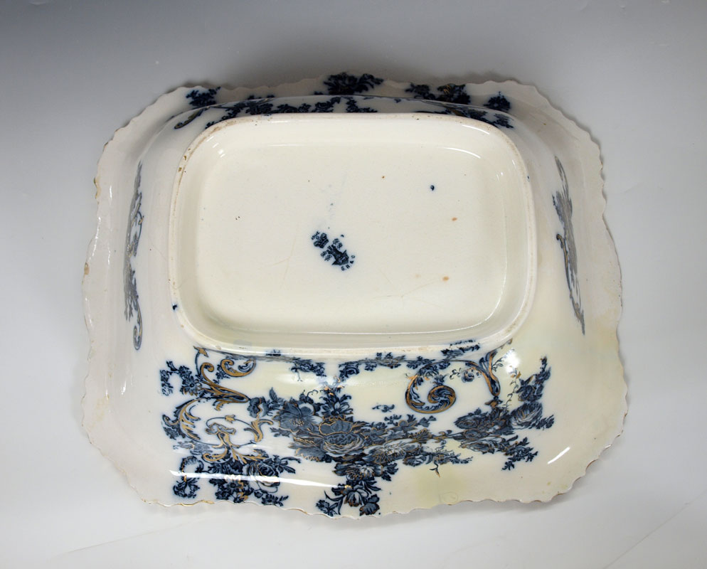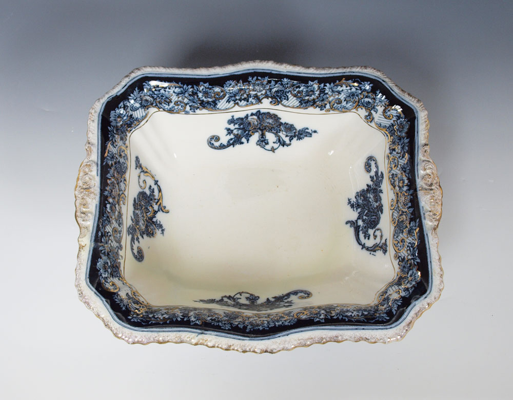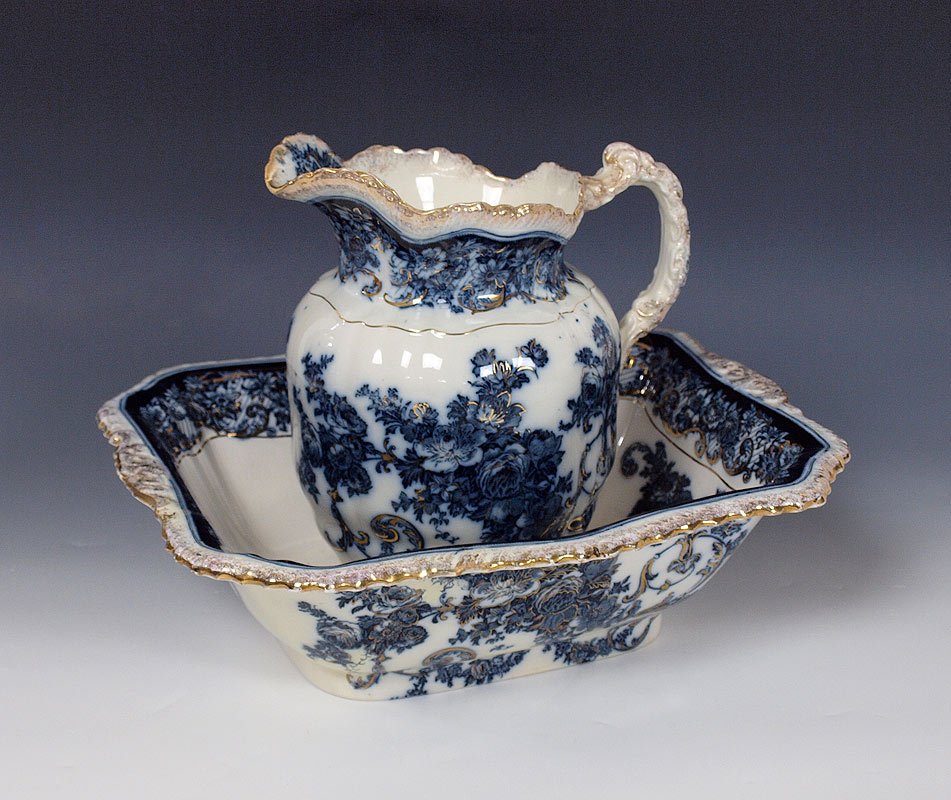 FLOW BLUE PITCHER & BOWL: Rectangular bowl, 11'' pitcher. Unidentified backstamp. Professional restoration.