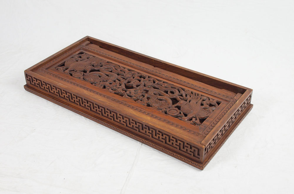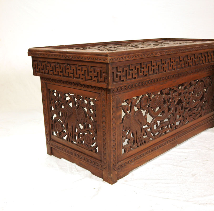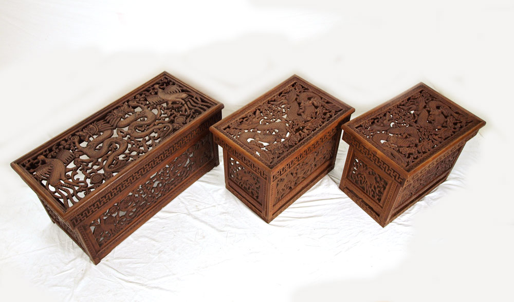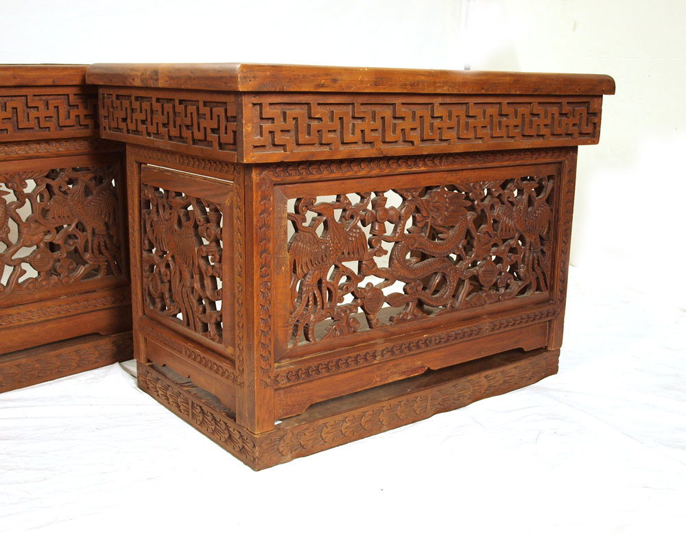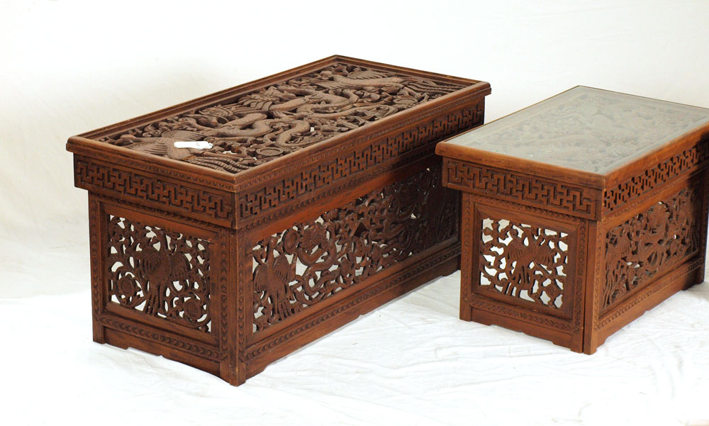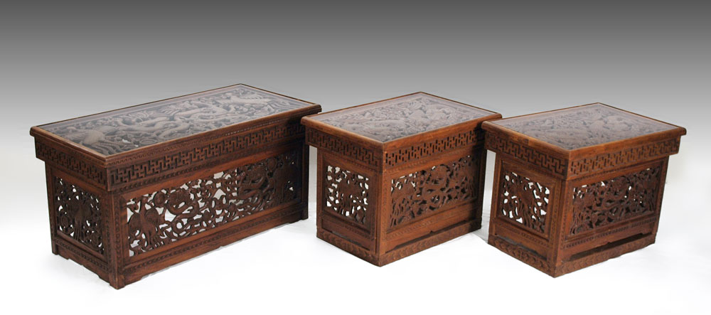 SET OF 3 NEPALESE CARVED WOOD FOLDING TABLES: Carved and pierced dragon designs. Largest measures 20'' h. x 40 1/4'' x 19 1/2''.