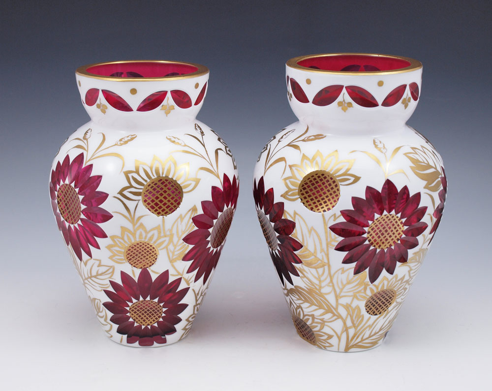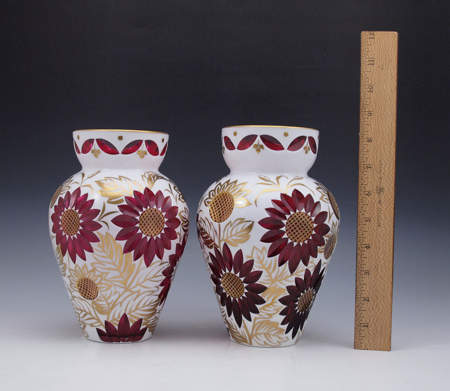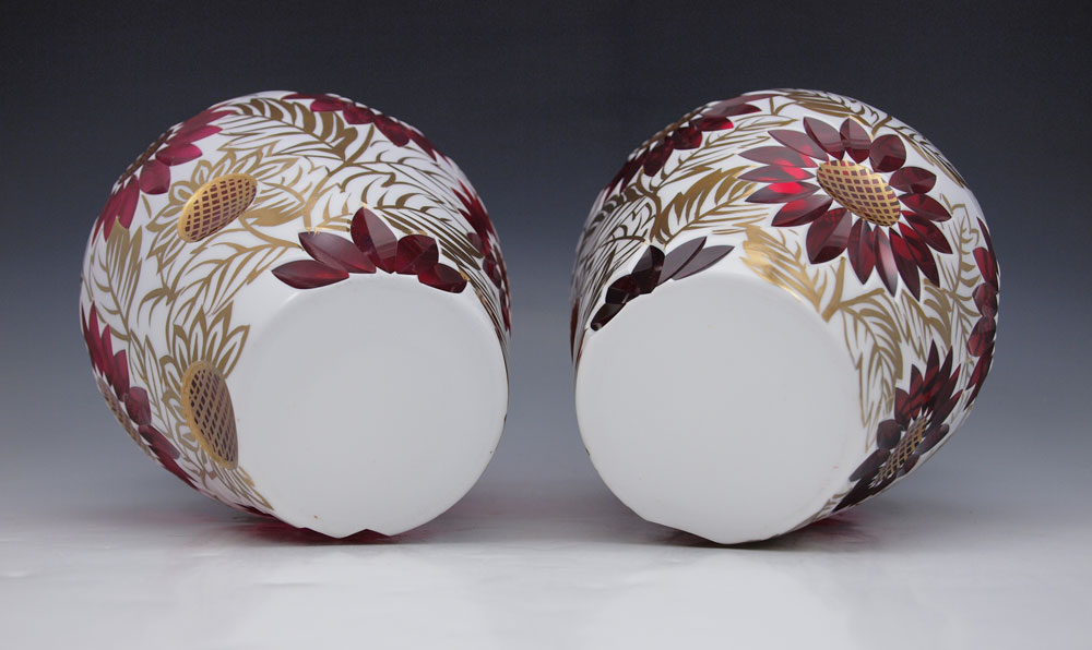 PAIR BOHEMIAN GLASS CUT TO CRANBERRY VASES: White over cranberry with painted gold accents. 8 1/2''h.