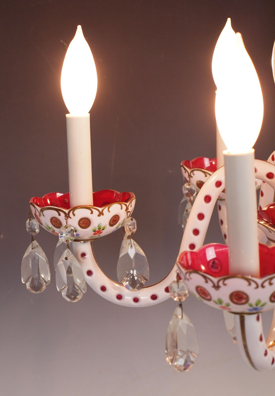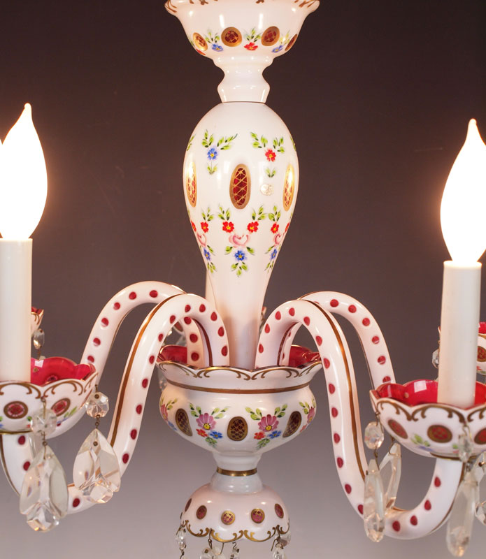 BOHEMIAN ENAMELED CRANBERRY GLASS CHANDELIER: 5 light, cased white cut to cranberry. Approx. 18'' tall (excluding chain), 20.5'' dia.
