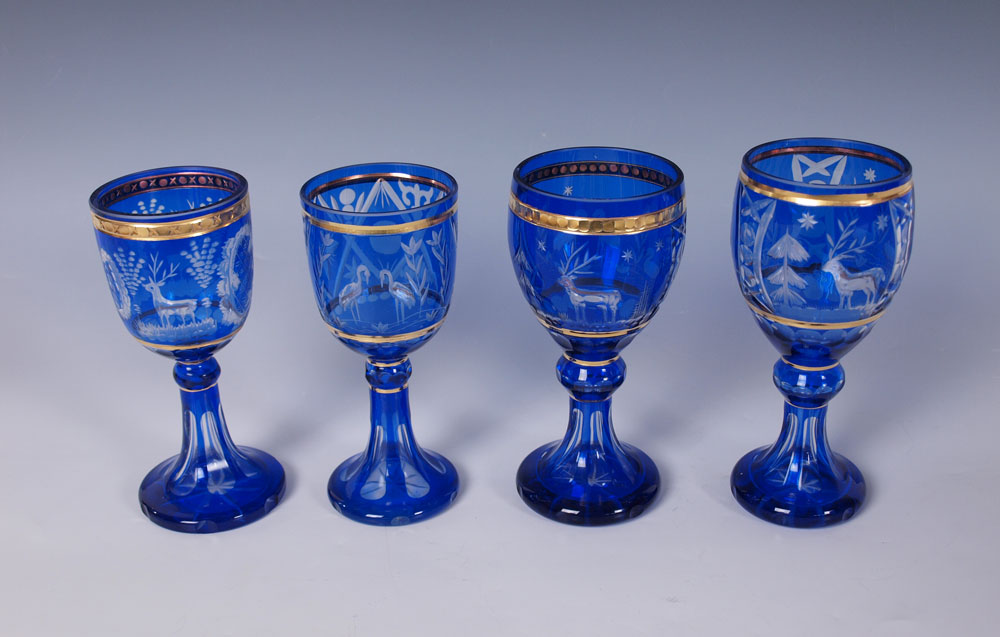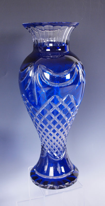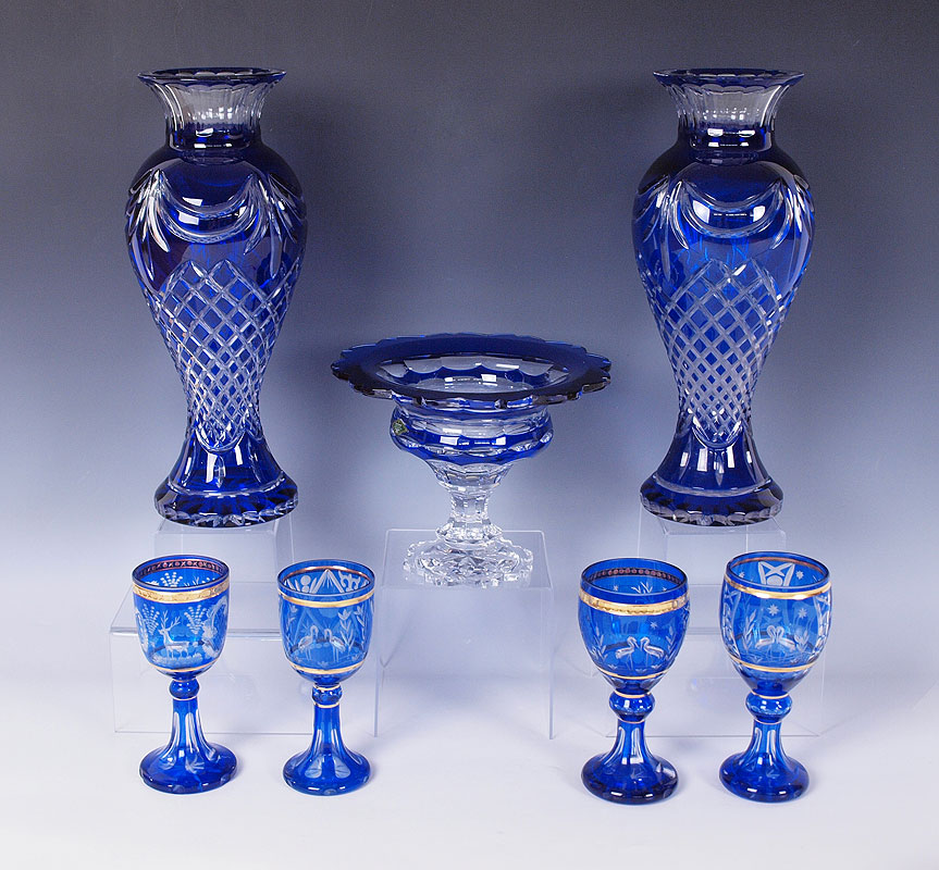COBALT CUT TO CLEAR COLLECTION: 7 piece group, Polish and Bohemian. Tall pair of 17'' vases, scallop rim compote, and 4 goblets.