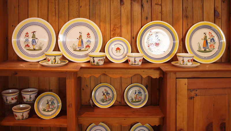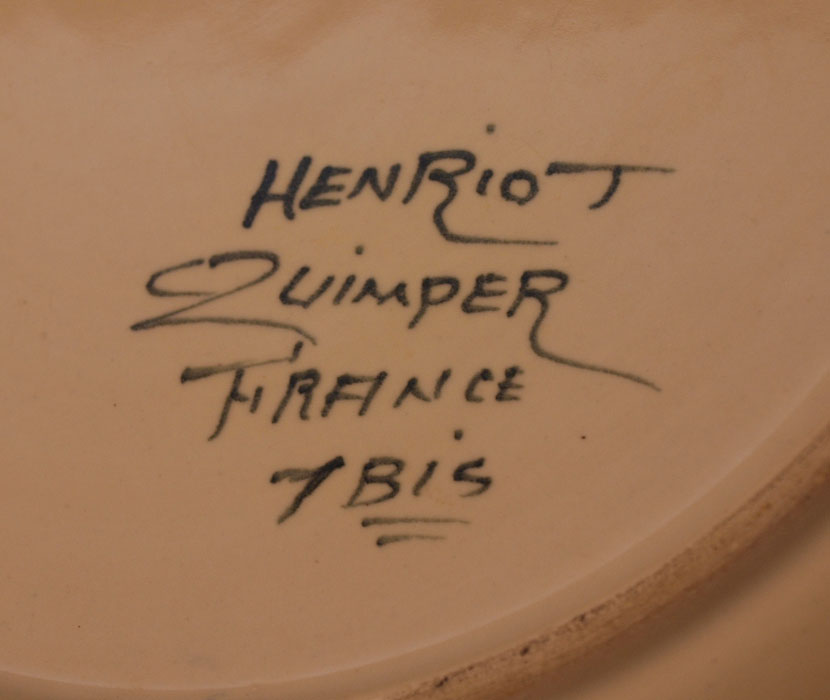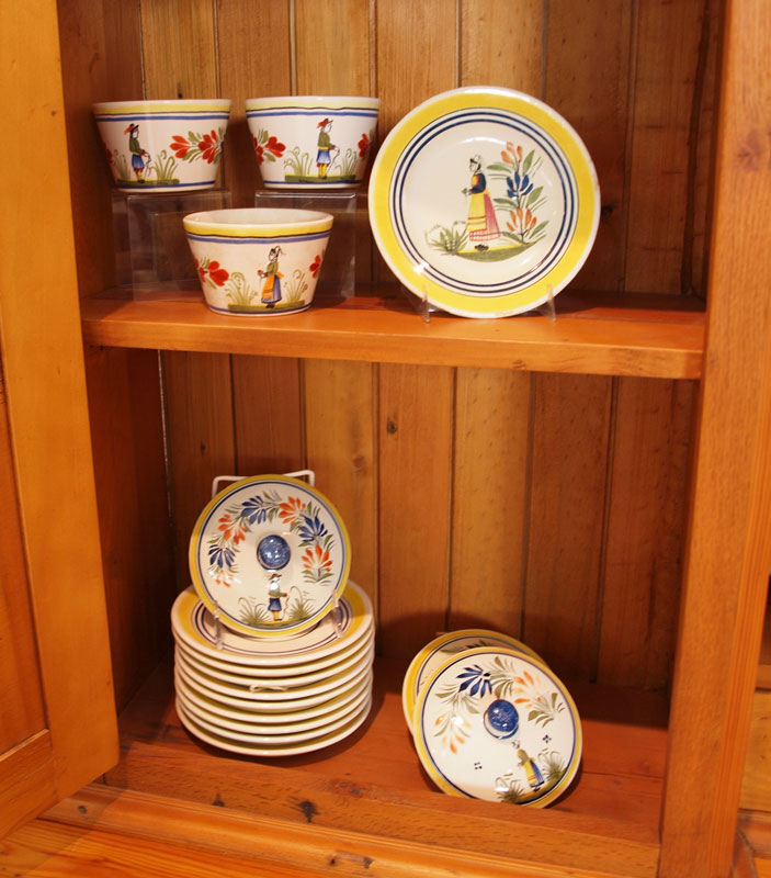 30 PIECE COLLECTION OF QUIMPER DINNERWARE: Approx. 30 pieces to include 4 dinner plates (10 7/8''), 9 cups (2 1/2'' h. ), 14 saucers (6 1/2''), 3 bread (6''), 3 lids (5''), small candle holders (2 1/2'' h.)