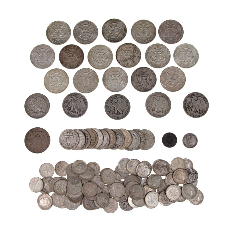 COLLECTION OF SILVER US COINS: To include 21 half-dollars 1941-D, 2 1942, 1943-S, 1945, 1959, 16 1964. 12 quarters 1937, 1937-D, 1944, 1946-D, 1951, 1953-D, 1959-D, 1960-D, 1961, 1962, 1963-D, 1964-D. Approx. 81 dimes including 1 1899 Barber, 1 1944 Mercury, the balance are assorted date Roosevelts. Ungraded. Approx 17.8 troy oz.