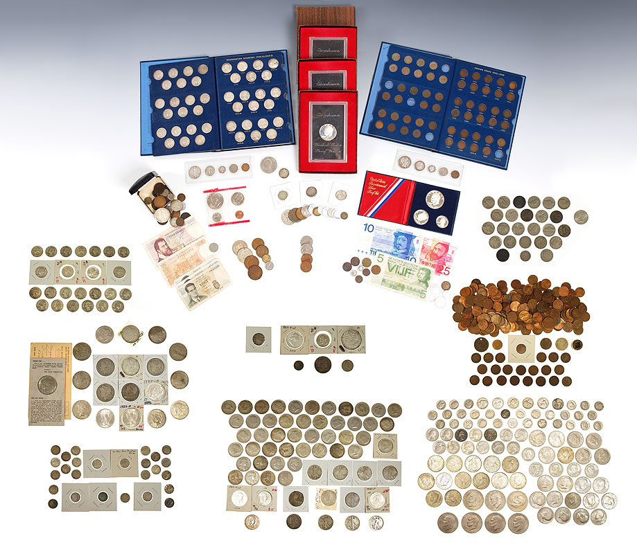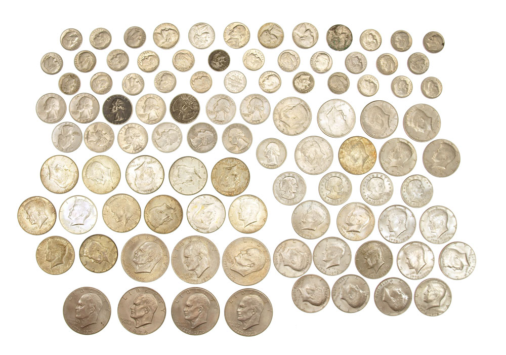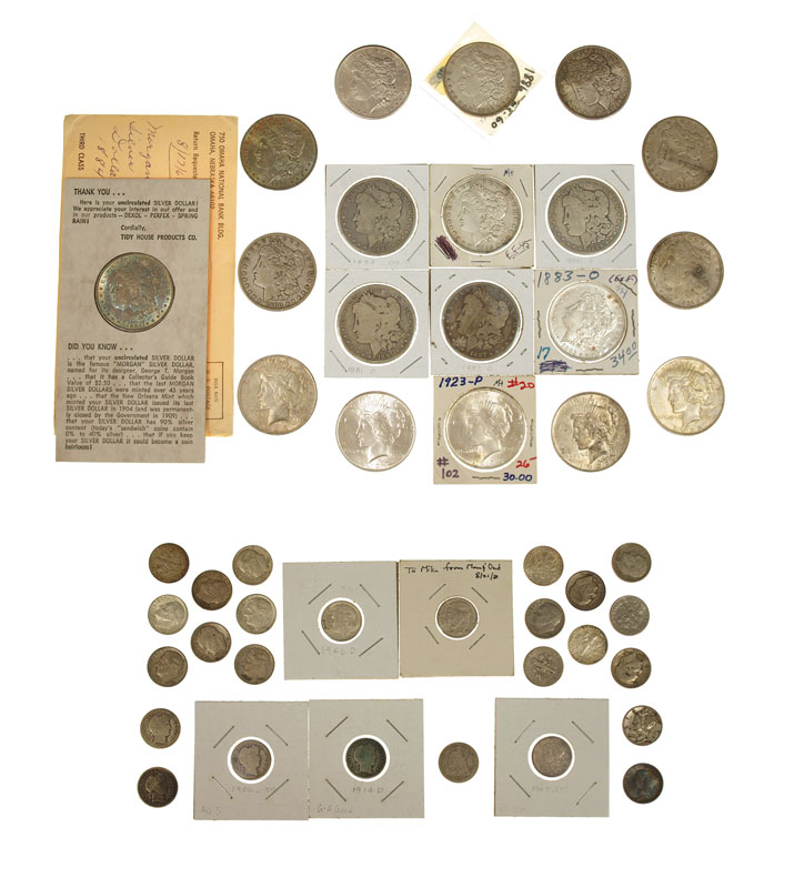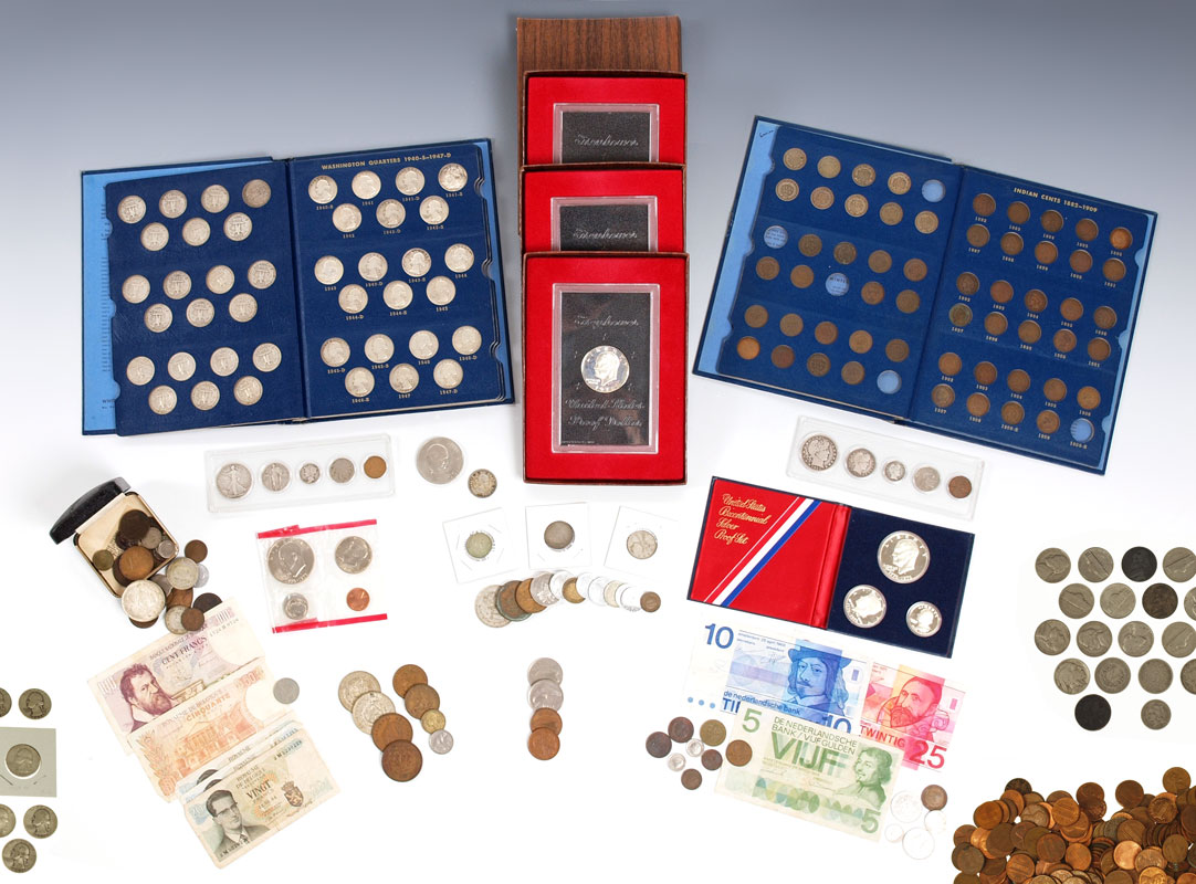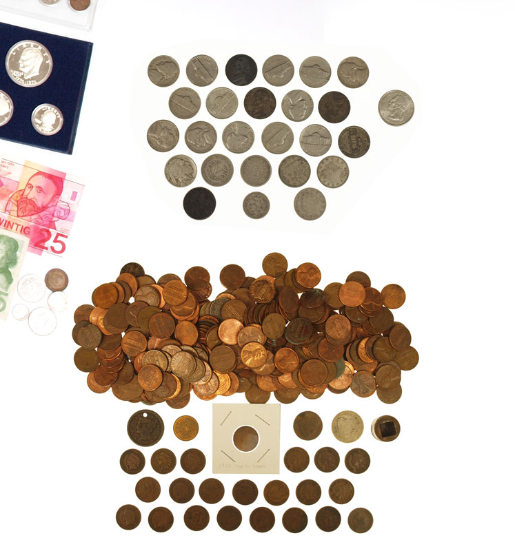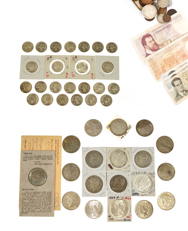 MASSIVE COLLECTION OF US COINS: Much to much to list all, highlights include 13 Morgan dollars, 5 Peace dollars, 1892 Columbian Exposition half dollar, 10 Walking Liberty half dollars, 11 Franklin half dollars (one being 1963 proof), 38 1964 Kennedy half dollars, 1854 Seated Liberty quarter, 24 pre 1964 quarters, 25 pre 1964 dimes, 24 pre 1964 nickels, 1865 3 cent nickel, 273 assorted pennies, 1847 penny with hole drilled. $33.80 in loose post 1964 coins. Complete set of 192-1964 Washington Quarters in book. Nearly complete set of 1856-1909 pennies in book (missing 1856, 1867, 1869 over 68, 1877, 1909-S). 3 1971 US Mint Proof Ike dollars in boxes. 4 assorted date sets. Also included is nice small collection of Foreign coins. Almost all ungraded and vary from almost uncirculated to poor.