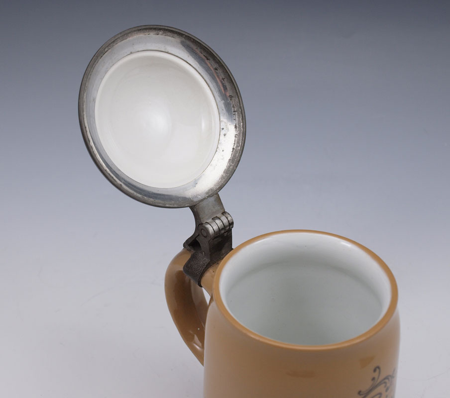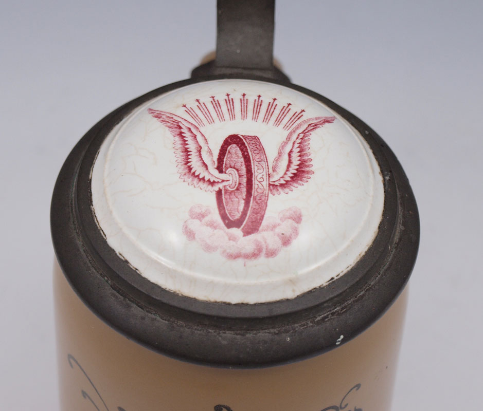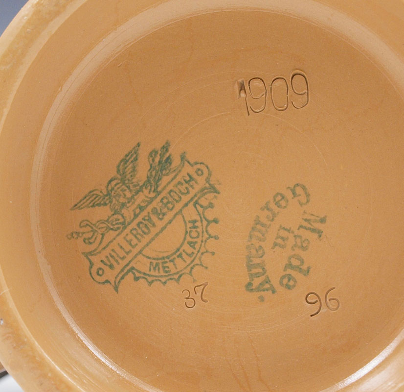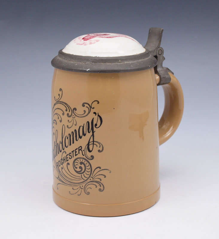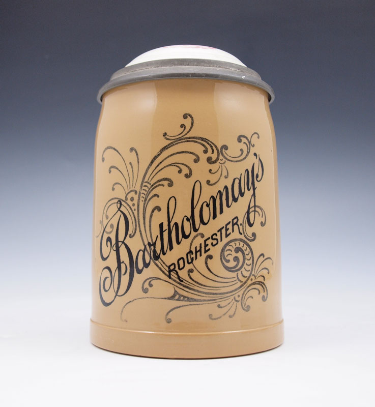 BARTHOLOMAY'S BREWERY VILLEROY & BOCH STEIN: Advertising stein for Bartholomay's Brewery Rochester. 4/10 Liter PUG stein with PUG lid featuring logo of wheel with wings. Green Villeroy & Bach stamp with impressed 1909. 5 1/2'' h. x 5'' overall.
