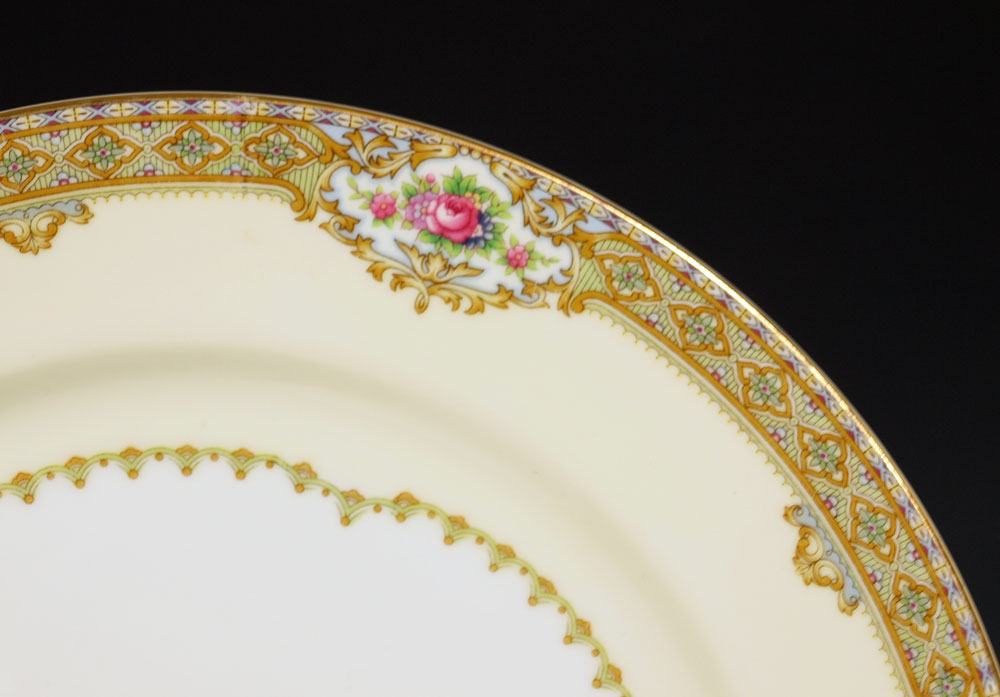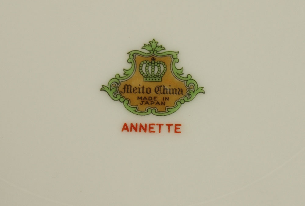 MEITO ANNETTE FINE CHINA SERVICE: 96 pieces to include 12 dinner plates, 12 square salad plates, 12 bread plates, 12 dessert bowls, 10 cream soups with 12 saucers, 11 cups with 10 saucers, and the creamer, sugar, vegetable bowl, 12 1/4'' platter, 16'' platter.