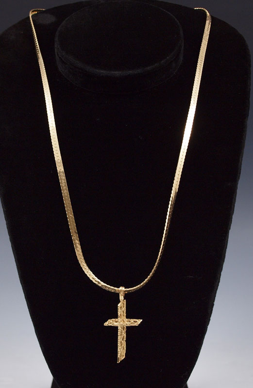 14K HERRINGBONE CHAIN AND CROSS: 14K yellow gold flat herringbone chain. Length: 24''. Width: 3.5 mm. 14K lacy nugget cross pendant. Length: 1 3/4'' Weight: 22.0 grams.