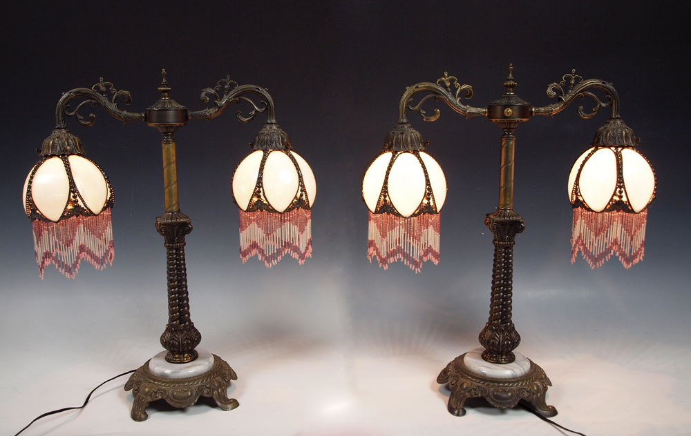 PAIR MEYDA TIFFANY VICTORIAN STYLE TABLE LAMPS: Marble and metal base, glass beaded fringe on the double iridescent shades. Approx. 24'' tall, 20'' dia. New with tag.