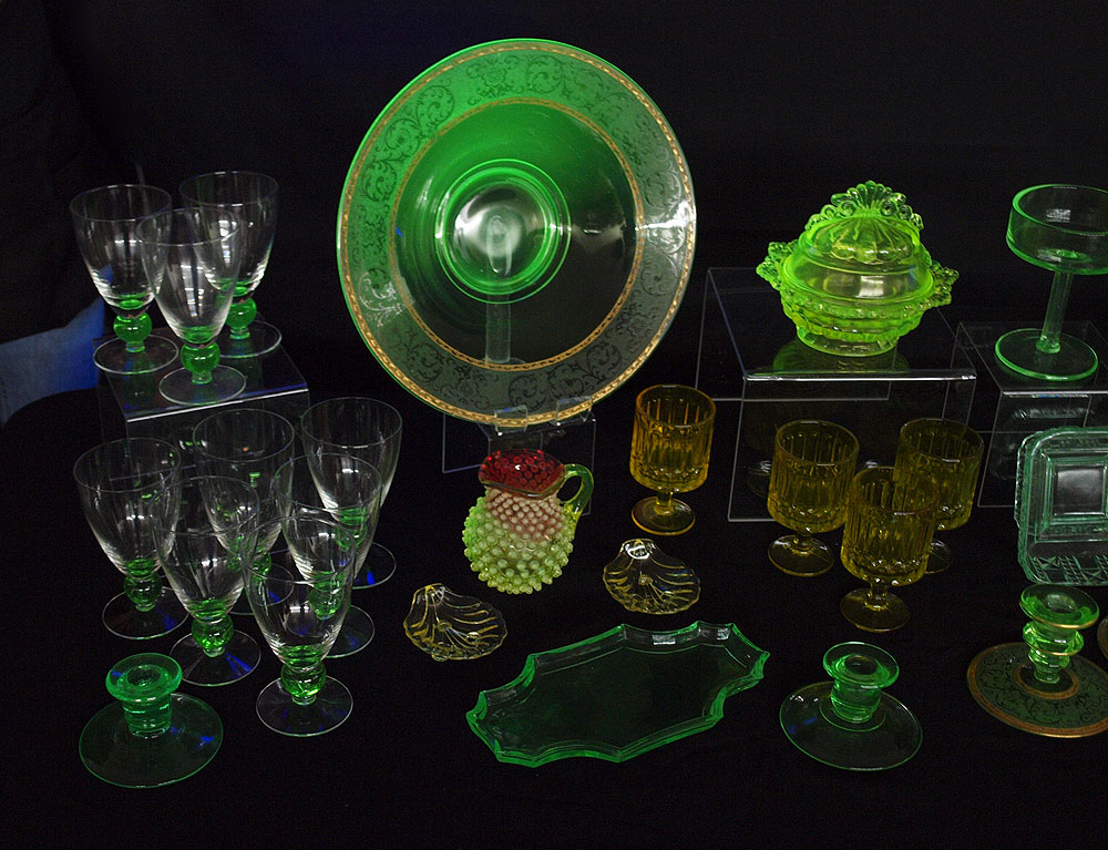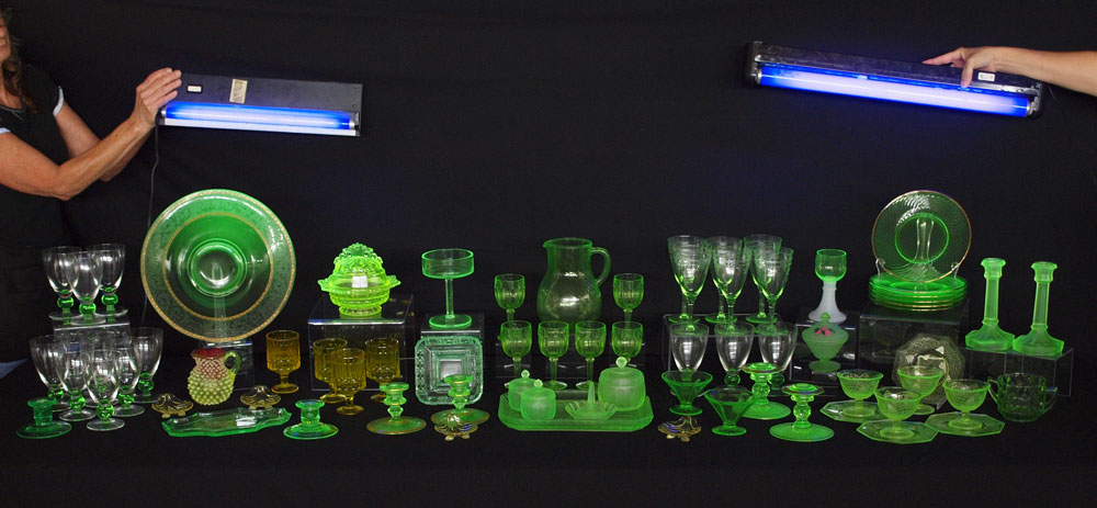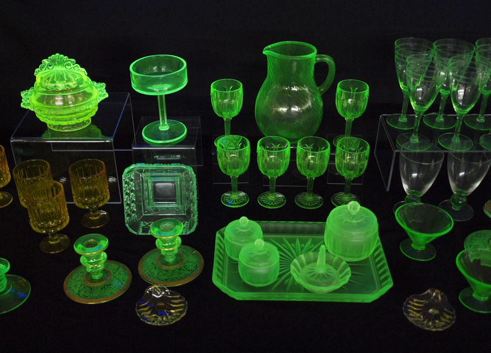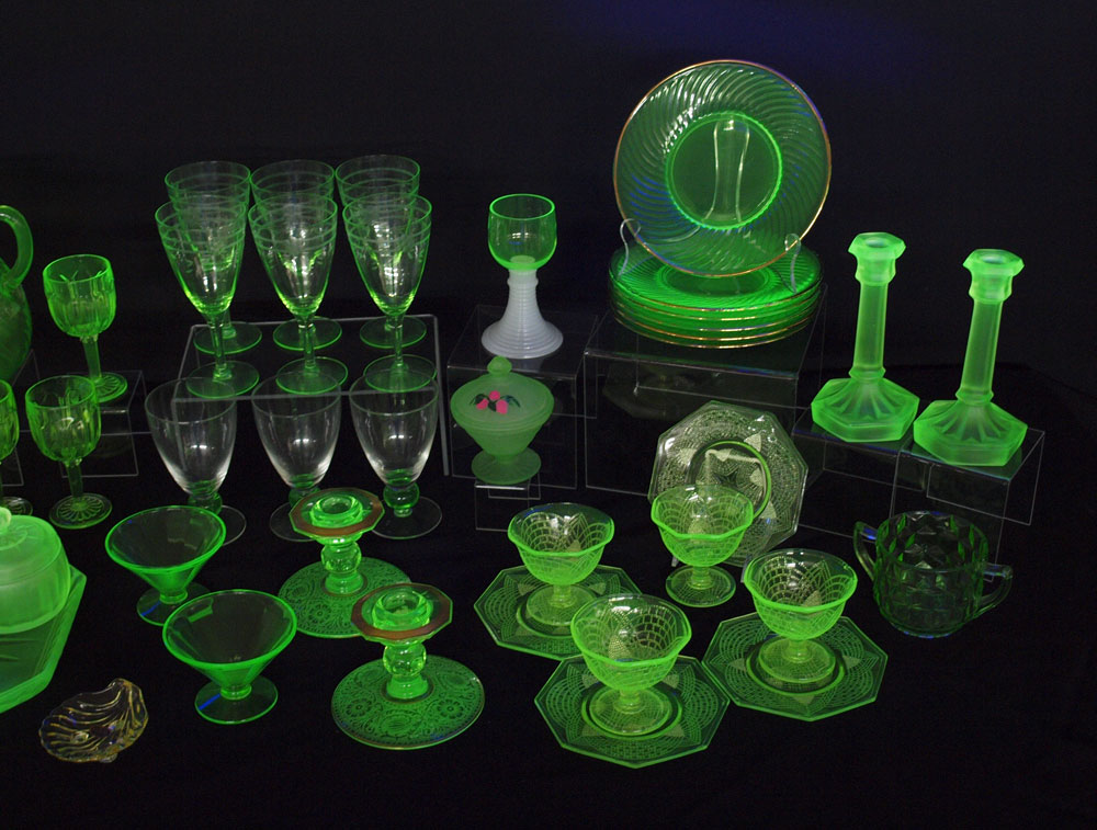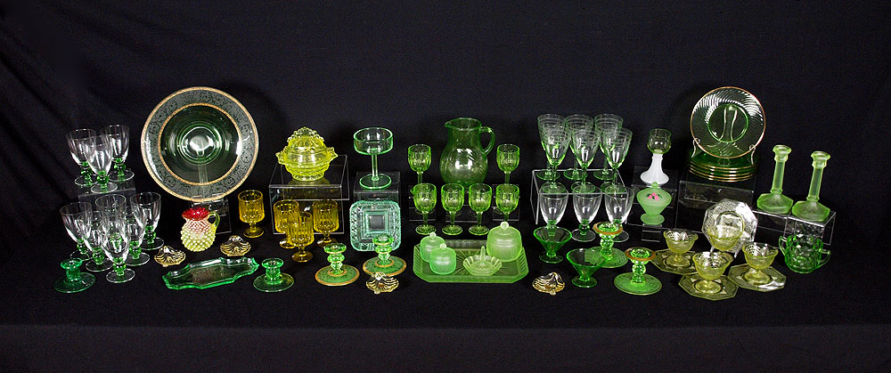 ACCUMULATED COLLECTION OF VASELINE GLASS: Approx. 71 pieces to include set of 6 etched goblets, set of 12 ball stem goblets, set of 3 wine stems, pitcher, 6 candle holders, 6 gold rim plates, set of 4 sherberts with underplates, covered butter, dresser set on tray. Assortment of patterns and makers.