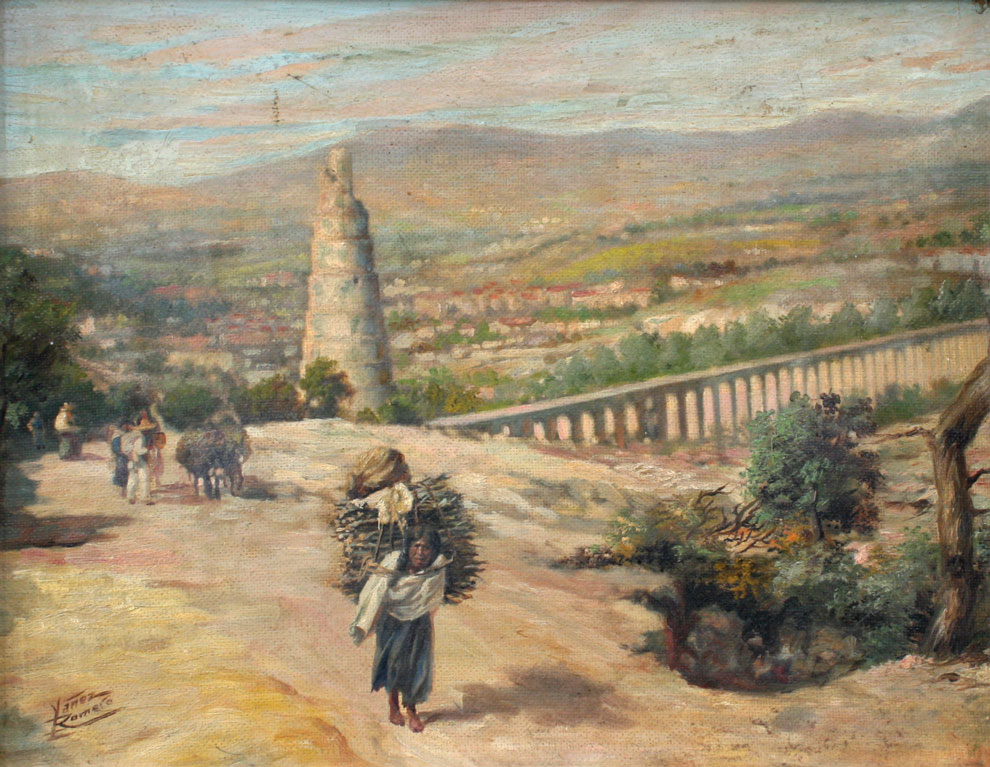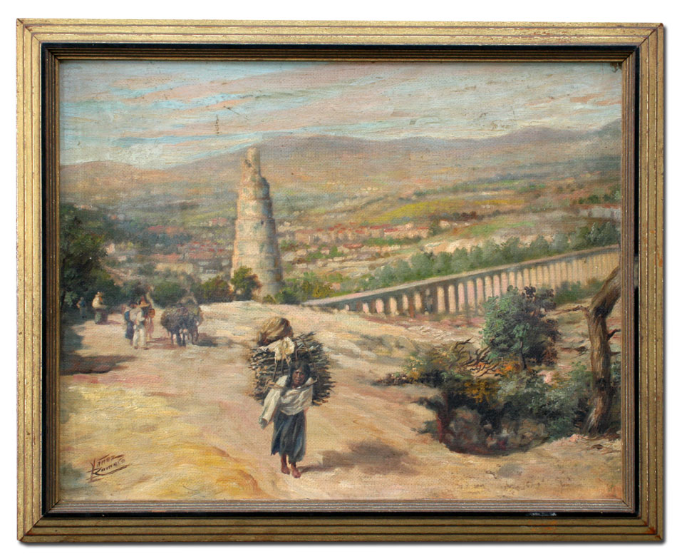 SOUTH AMERICAN PAINTING OF A PEASANT WOMAN: She carries a bundle of sticks up a long steep road, with a panoramic vista of the village and beyond below her, Oil/CB, 11'' x 14'', signed Yanez? Romero, framed with wear, 12 1/2'' x 15 1/2''.