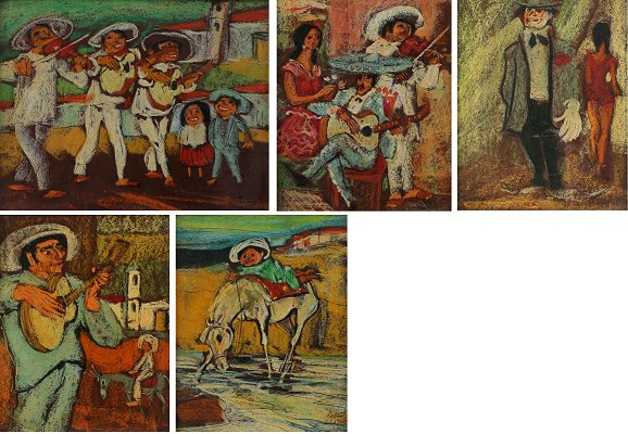 LOPEZ-RUIZ, Carlos, (Cuban/American, 1910-1953): 5 Piece Lot, Oil/Board, 10'' x 8'', depicting various scenes to include: a clown and circus girl, musicians and children in a landscape, musician and young boy on burro, boy watering a horse, musicians in an interior.