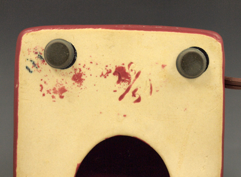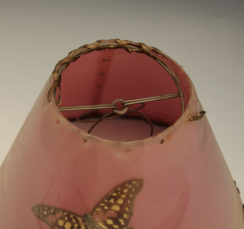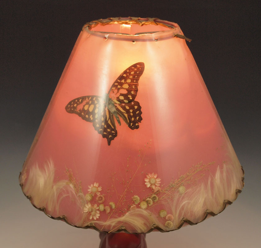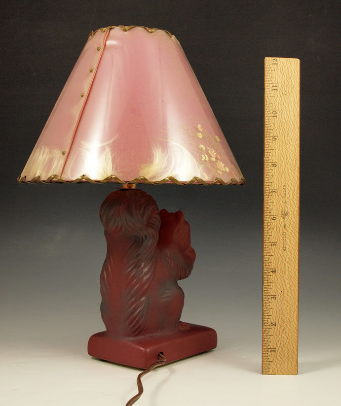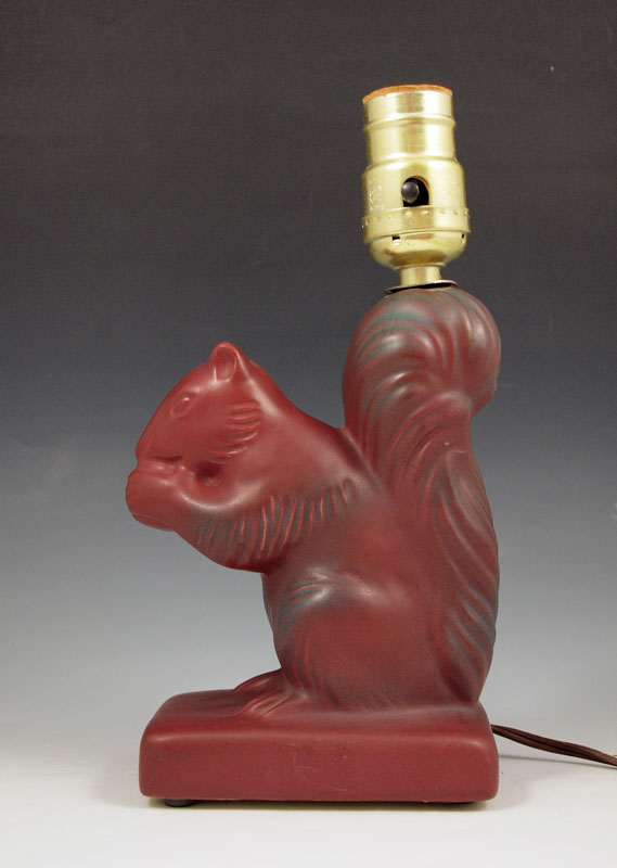 VAN BRIGGLE POTTERY FIGURAL SQUIRREL LAMP: Persian Rose, with original shade. Squirrel is 6 1/2'', the lamp is 13'' overall.