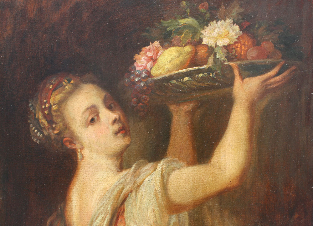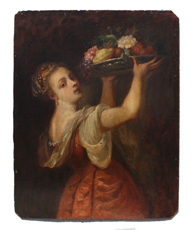 VICTORIAN OIL/BOARD OF A YOUNG WOMAN HOLDING A PLATTER OF FRUIT IN THE MANNER OF TITIAN: 18 3/4'' x 15'', unframed.