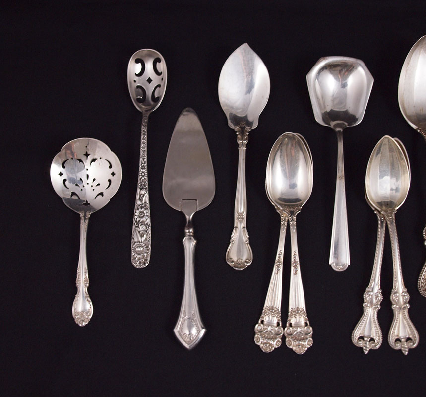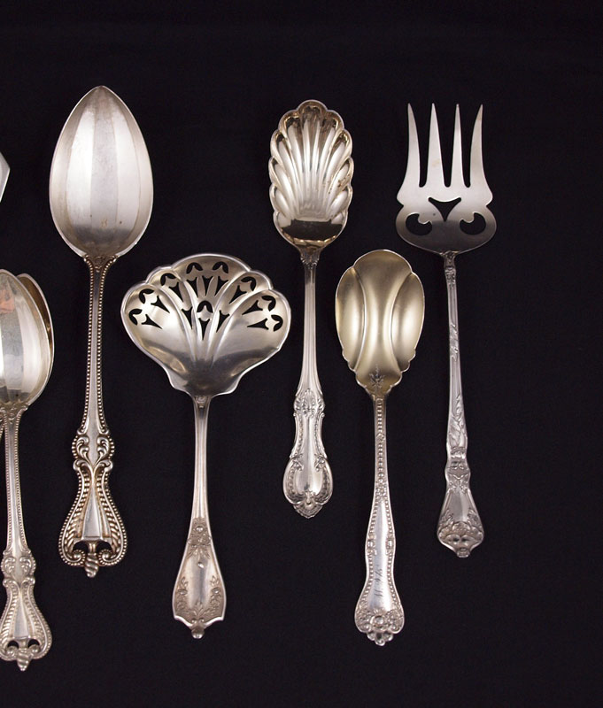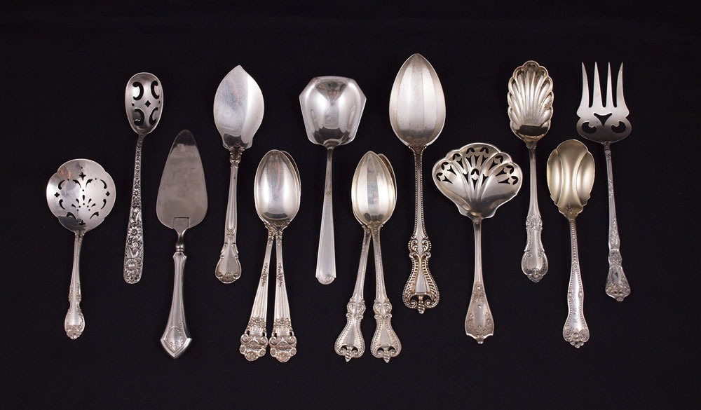 14 PIECE ESTATE COLLECTION OF STERLING FLATWARE: 14 pieces by assorted makers and patterns to include Towle, Whiting, Rogers, Kirk & Sons Repousse, Baker-Manchester, Gorham. Approx. 11.2 troy oz.