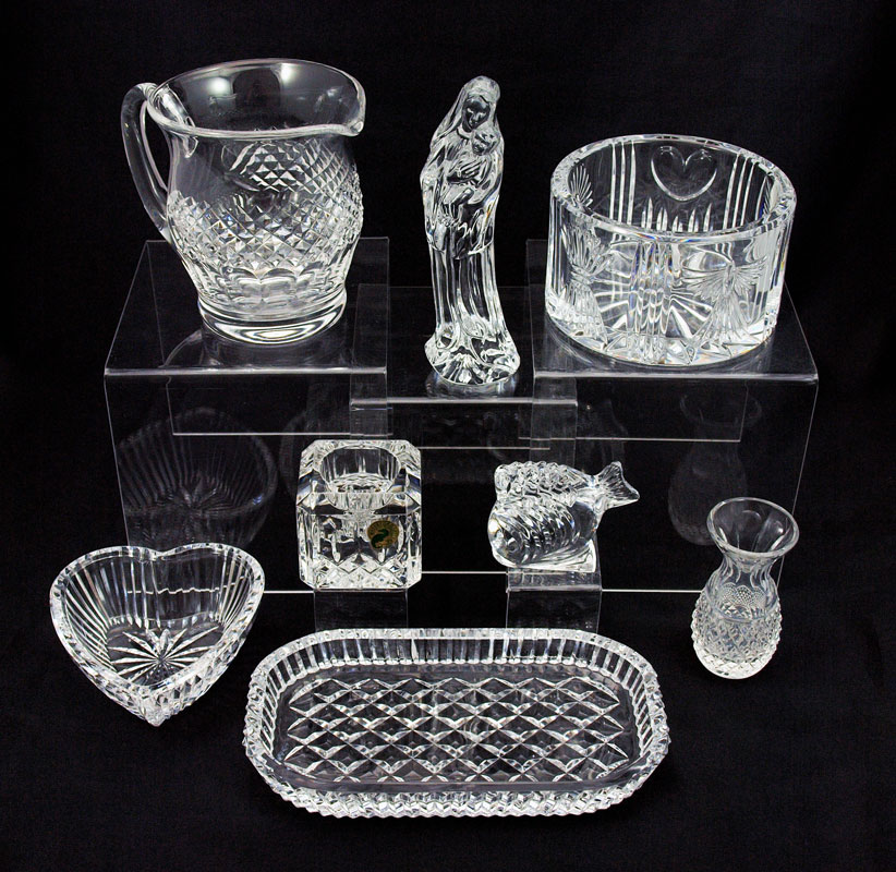 LOT OF WATERFORD: To include pitcher, small vase, candleholder, open jar, fish figure, Madonna figure, heart tray, small tray.