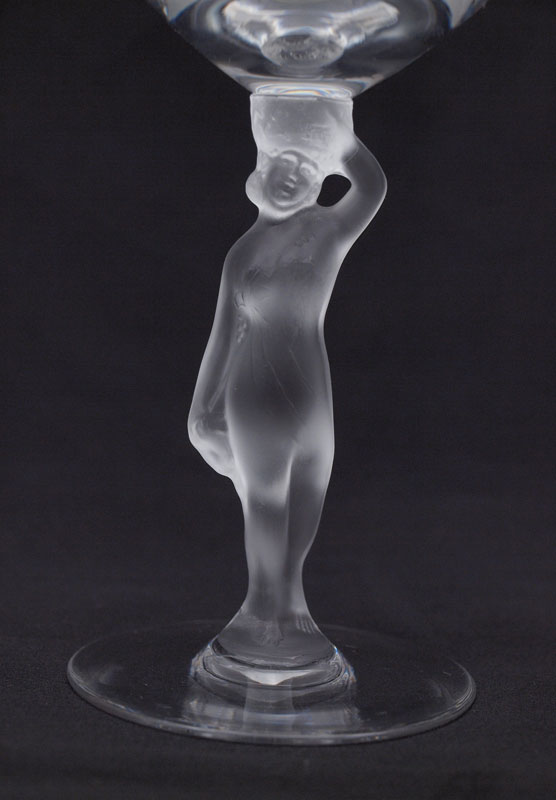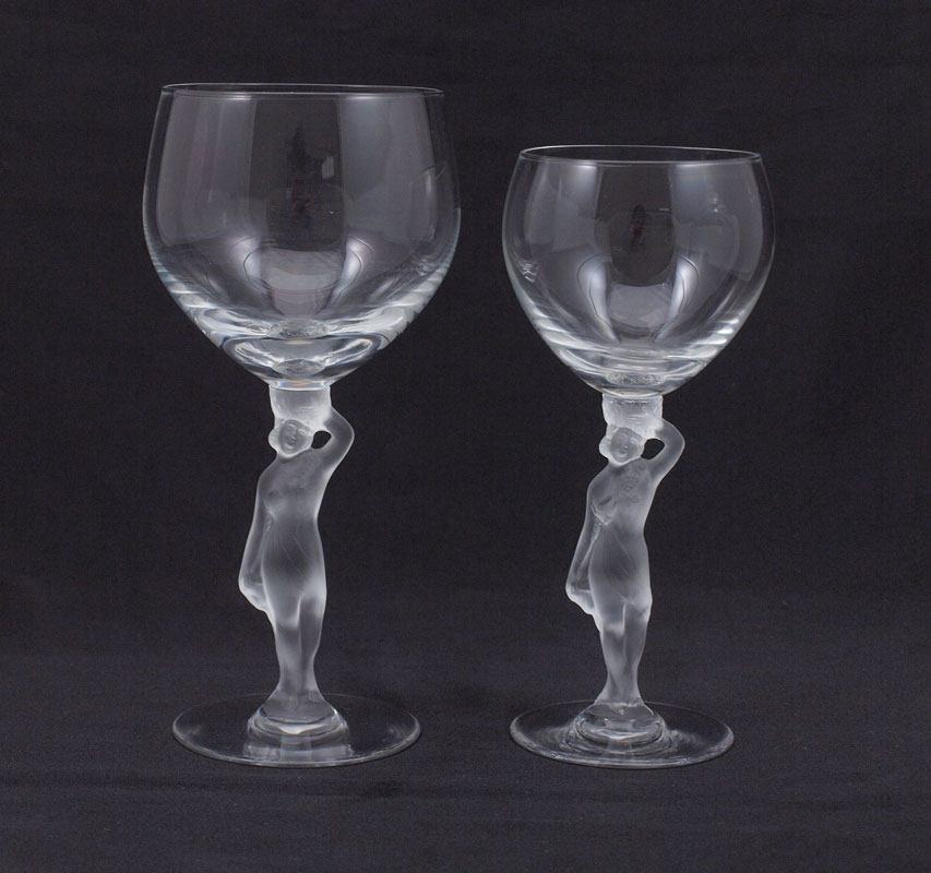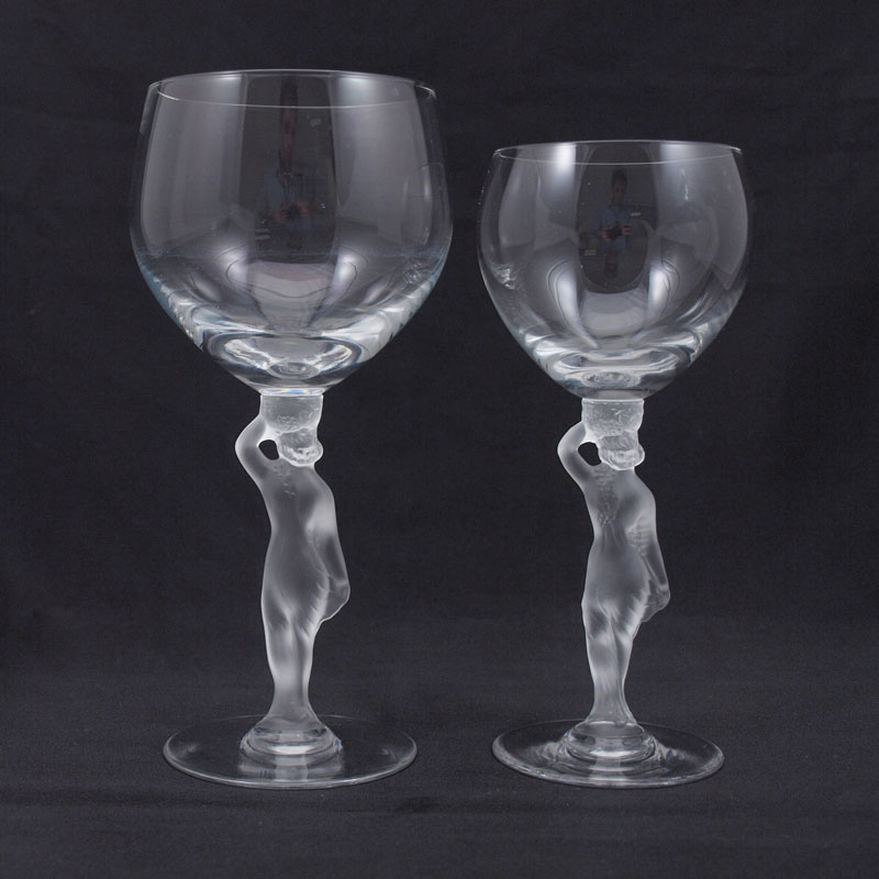 8 FIGURAL NUDE WINE STEMS: 4 of each size, 6 3/4'' and 7 1/4''. The bowl supported by satin glass nude.