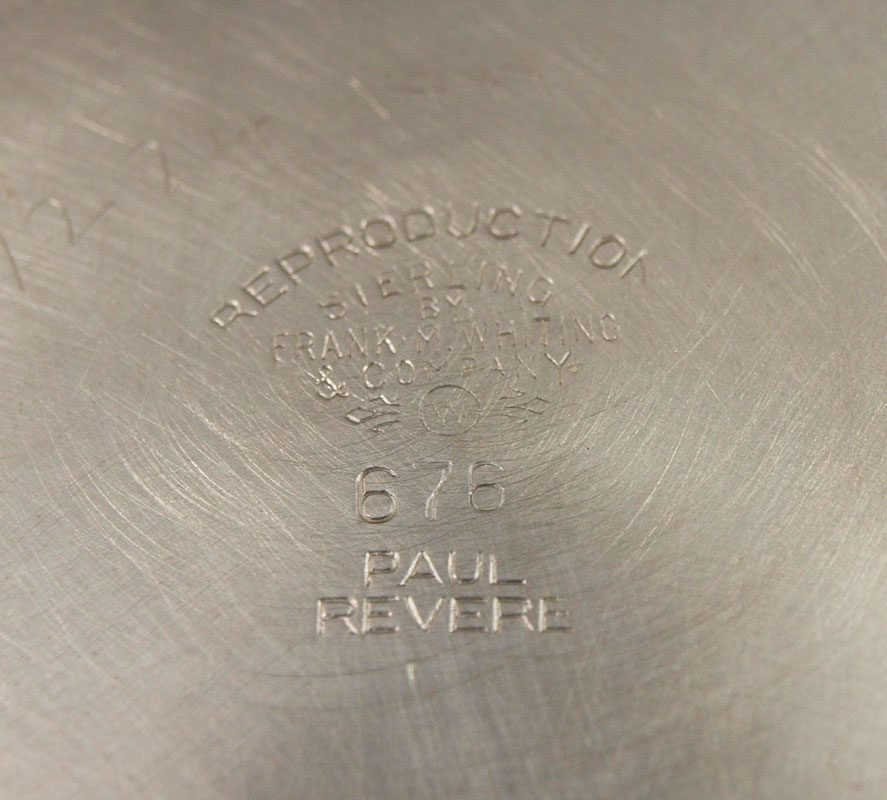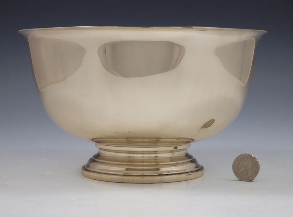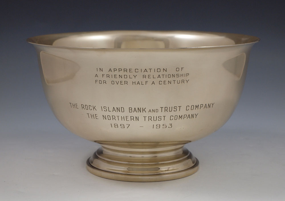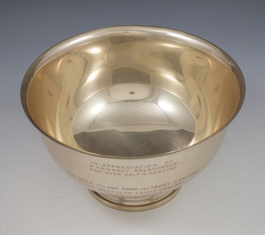 1953 WHITING STERLING PRESENTATION BOWL: Whiting Paul Revere Reproduction center bowl inscribed ''In Appreciation of a Friendly Relationship For Over Half a Century, The Rock Island Bank and Trust Company, the Northern Trust Company, 1897-1953. 5 1/4'' x 9'' dia. Approx. 20.7 troy oz.