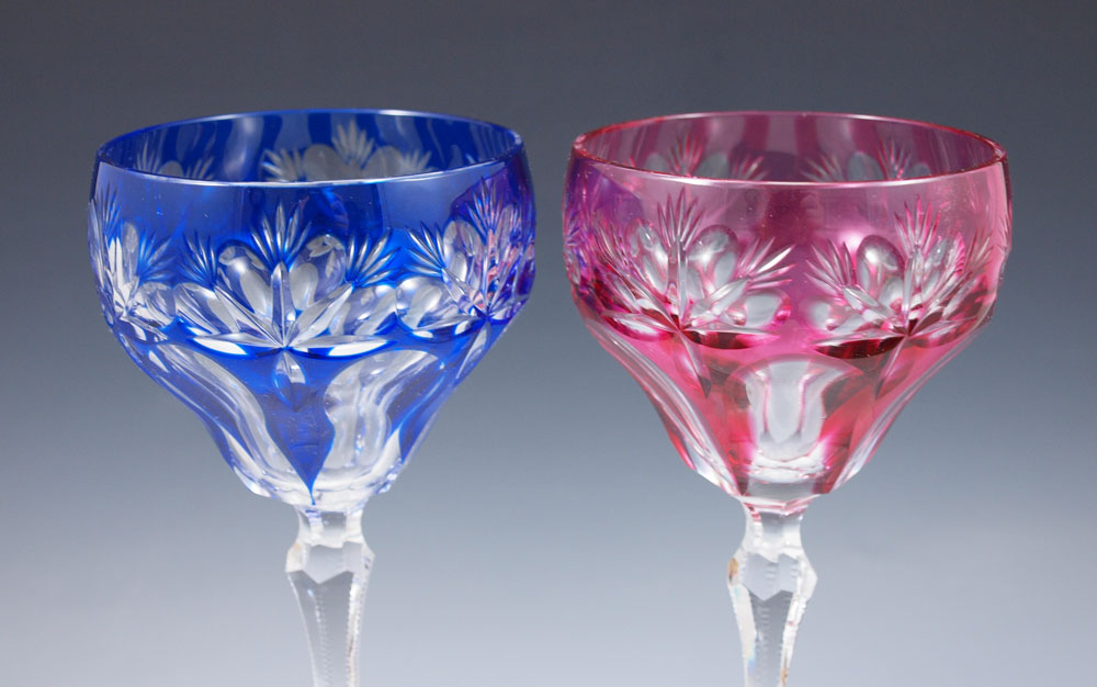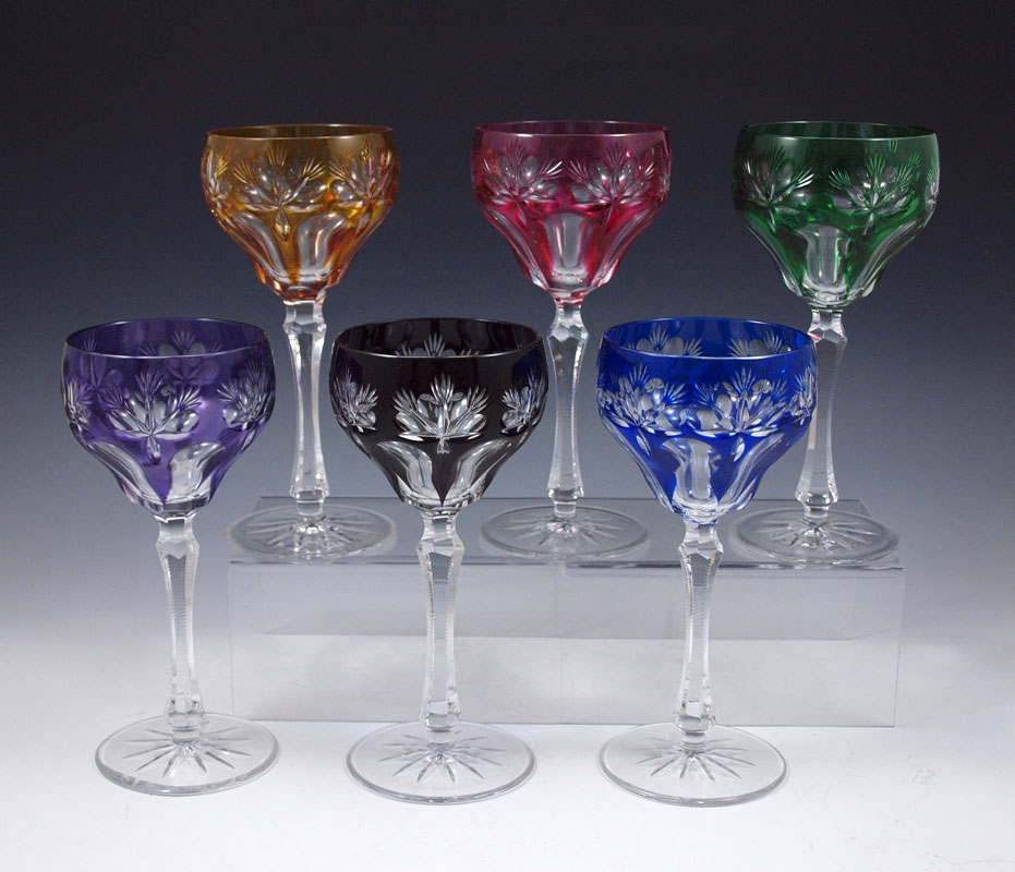 6 PIECE MULTI COLOR CUT TO CLEAR STEMWARE: Hungarian, 7 1/2'' h. x 3 1/4''.
