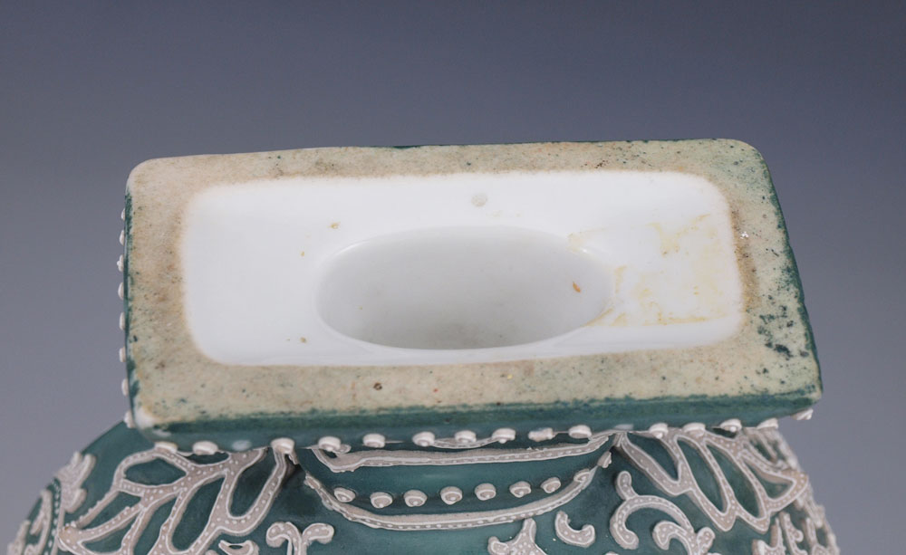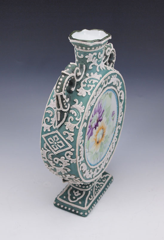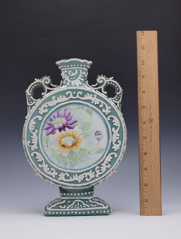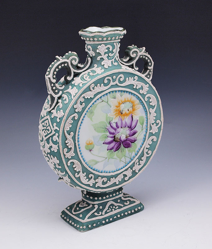 MORIAGE MOON VASE WITH HANDLES: Hand painted flowers center. Unsigned. 10 1/4'' h. x 7''