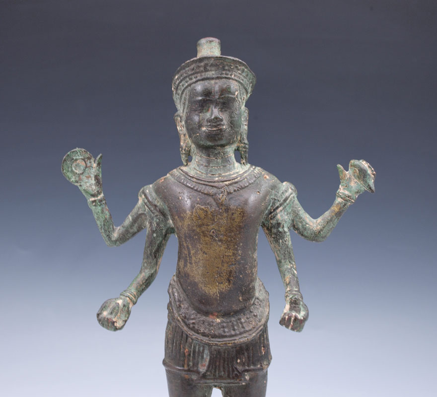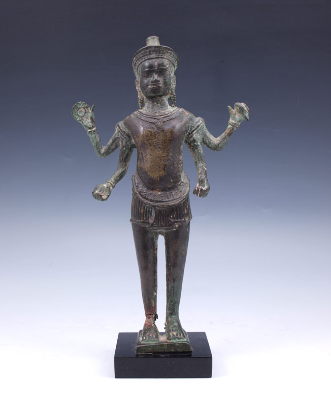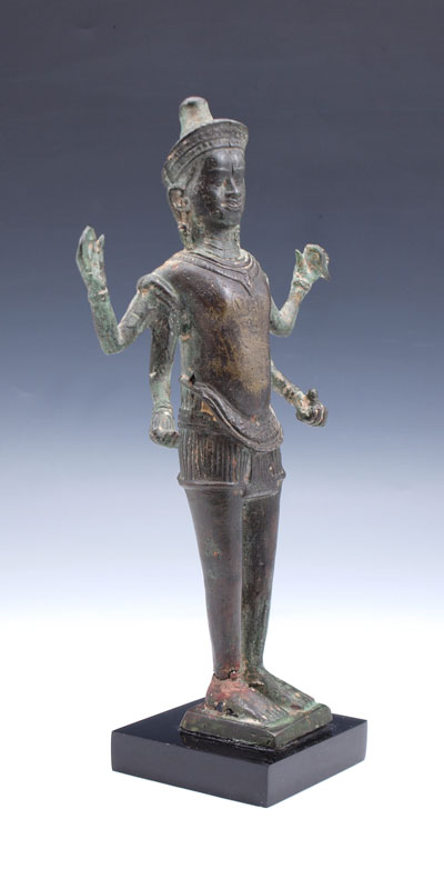KHMER STYLE BRONZE OF VISHNU: 13TH C., Standing on a short skirt, holding 4 attributes and wearing a short, flaring diadem, 10 1/2'' h. Purchased Doyle Galleries, N.Y.