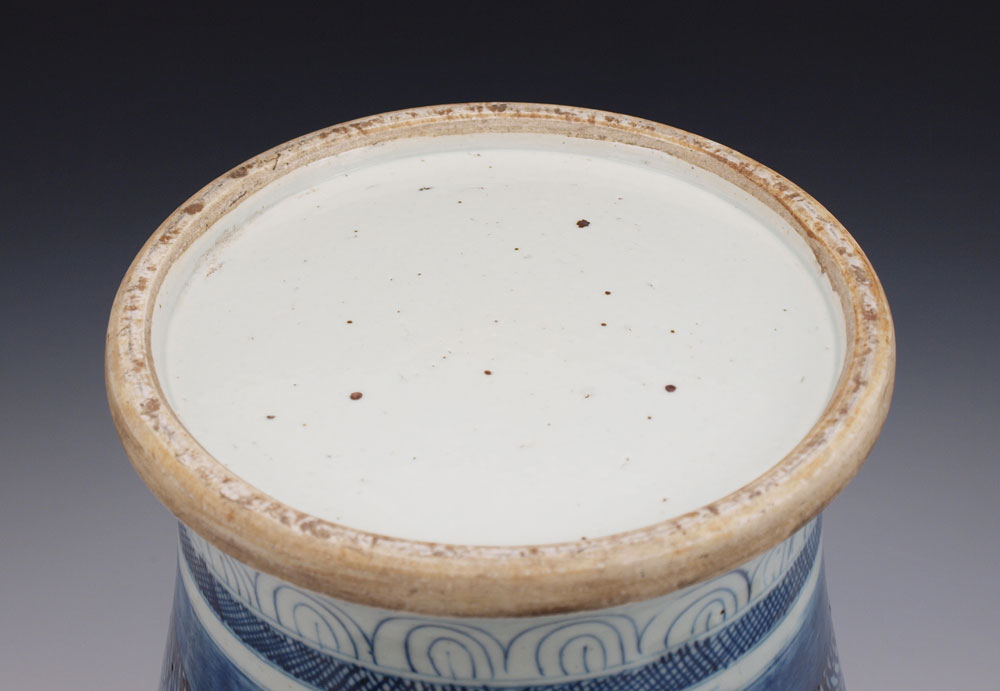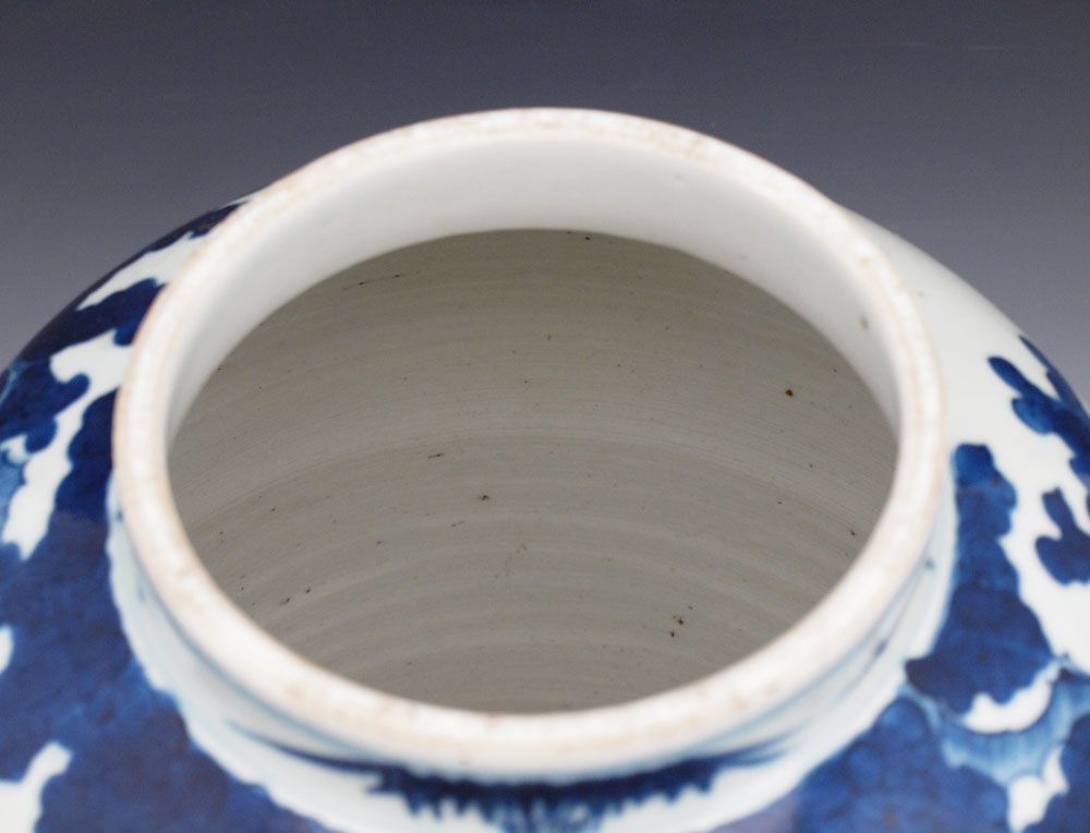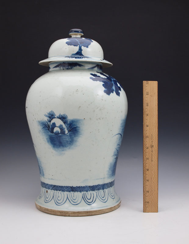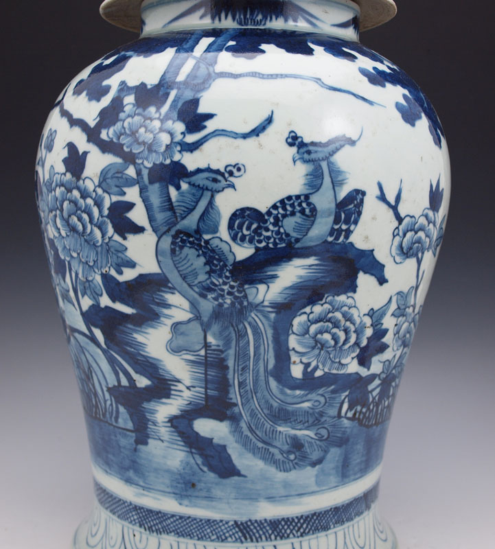 MODERN CHINESE BLUE DECORATED COVERED JAR: Birds and floral motif. 17 1/4'' h. x 9 1/2''.