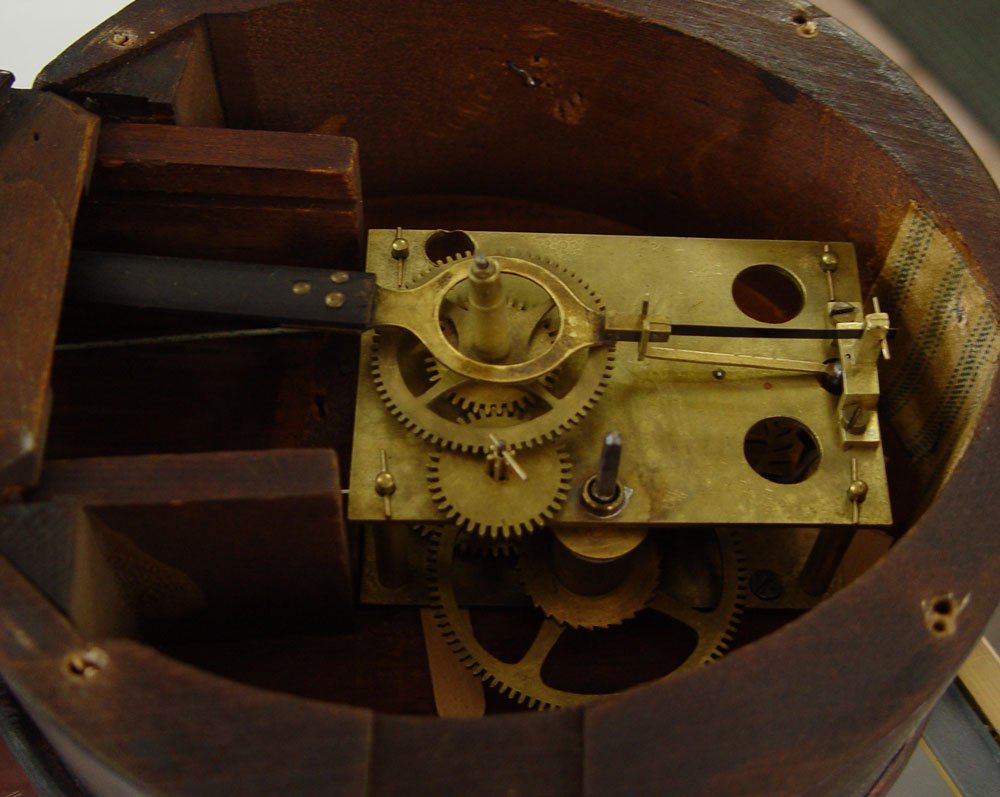 EARLY 19TH CENTURY REVERSE PAINTED BANJO CLOCK: Reverse painted glass with Dutch windmill scene on bottom glass. Center glass has floral, eagle and Federal shield. Unsigned weight driven key & pendulum movement & painted metal face with Roman numerals. 33 1/2'' h. x 10'' x 3 3/4''.