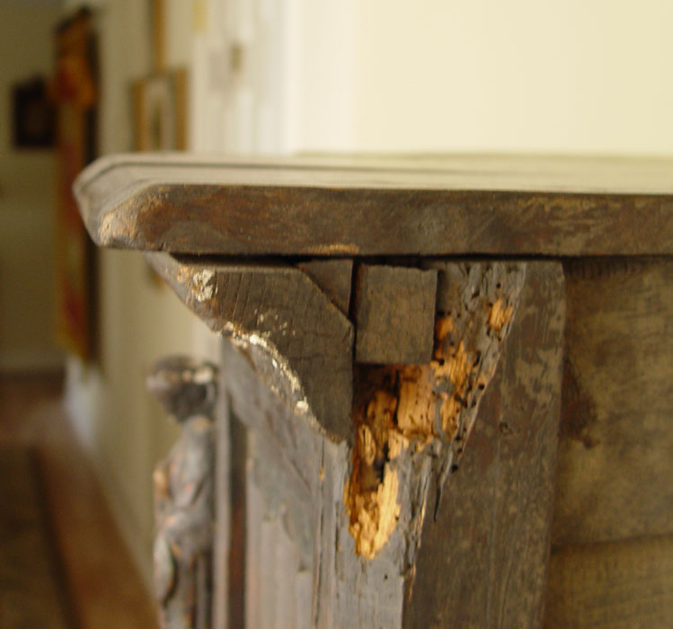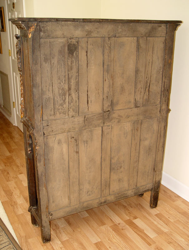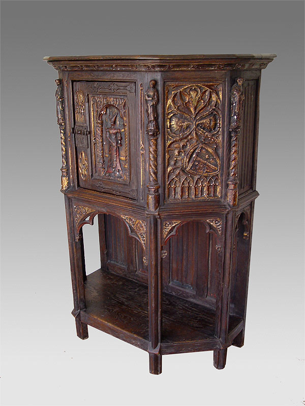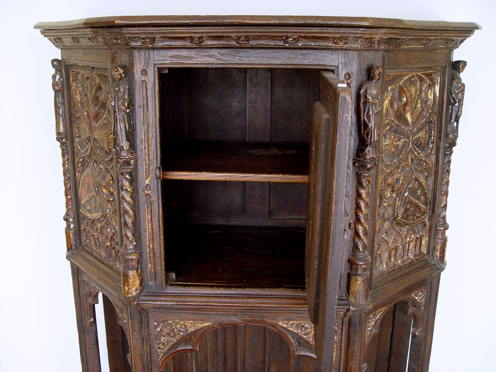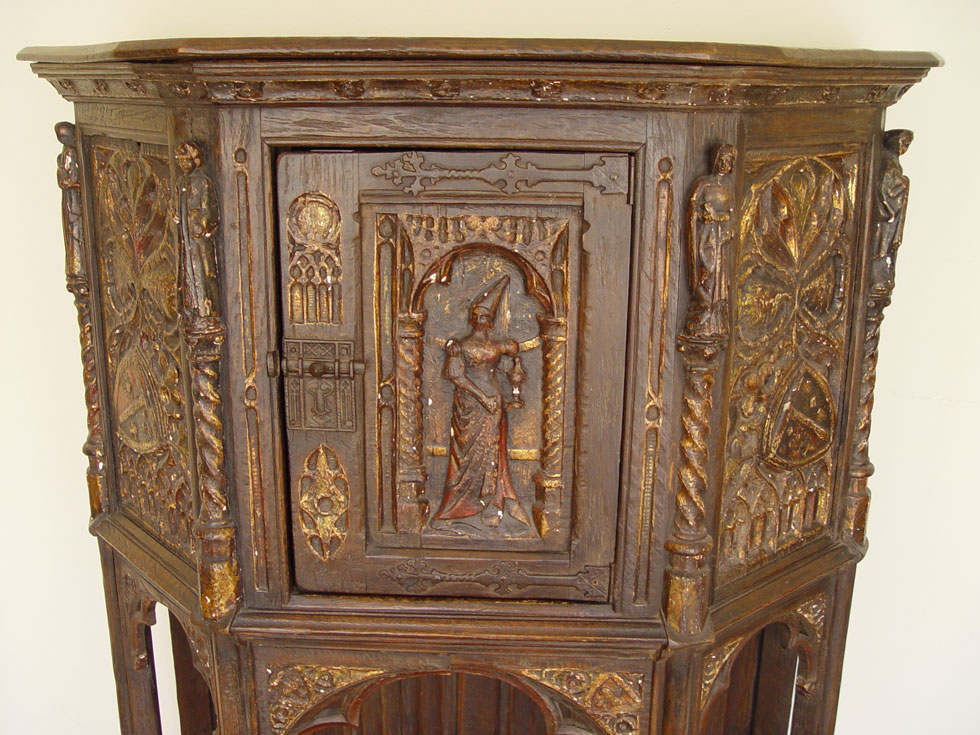 RENAISSANCE CARVED CABINET ON STAND: Extensive carvings featuring a maiden on the single door. Carved wood and gesso figures cap the spiral stiles. Relief carved panels. Remnants of the gilding is visible. Approx. 59h. x 44'' x 21 1/2''.