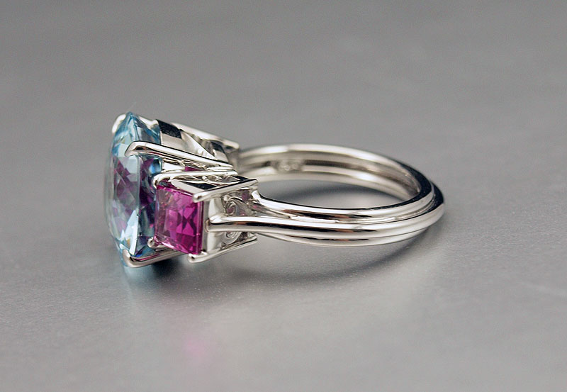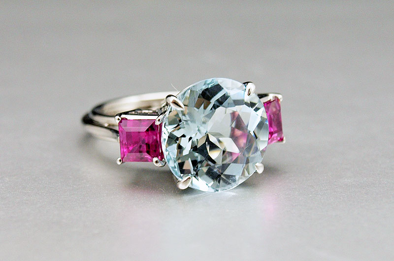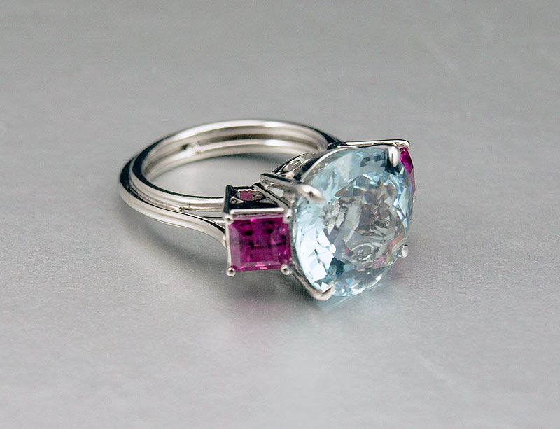 PLATINUM AQUAMARINE RING: Handmade platinum ring centers a round mixed cut aquamarine, approx. 7.80 Ct. Rated VVS in clarity (Type I), vslgB in Hue, 2-3 in Tone and 2-3 in Saturation. Two pink stones of unknown origin (possibly pink sapphires). Weight: 11.6 grams. Size: 7.5 Signed: Dino