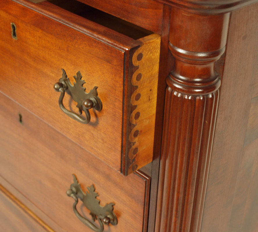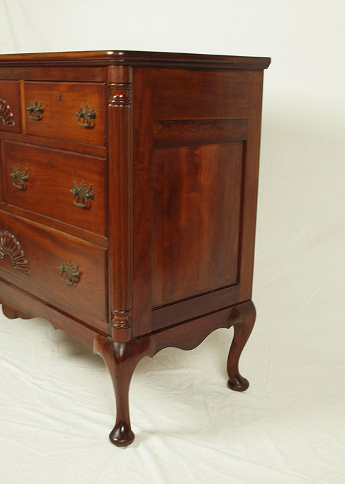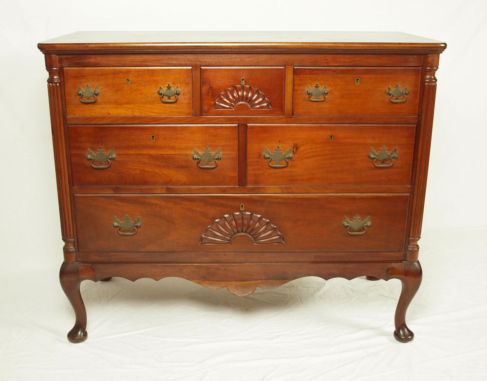 MAHOGANY QUEEN ANNE STYLE CHEST: 3 drawer over 2 over 1. Double shell carved drawer front. Ribbed 3/4 column front on bracket base with cabriolet legs and pad feet. 40 1/4'' h. x 48 1/4'' x 21''.