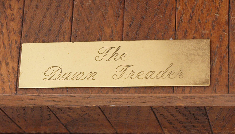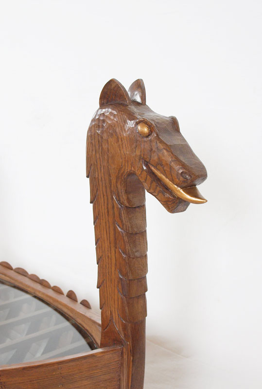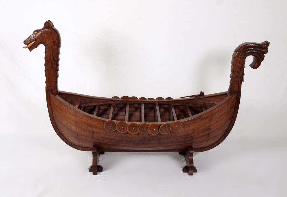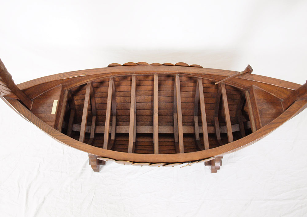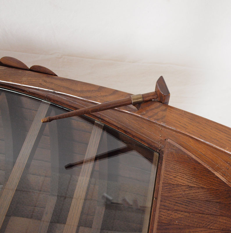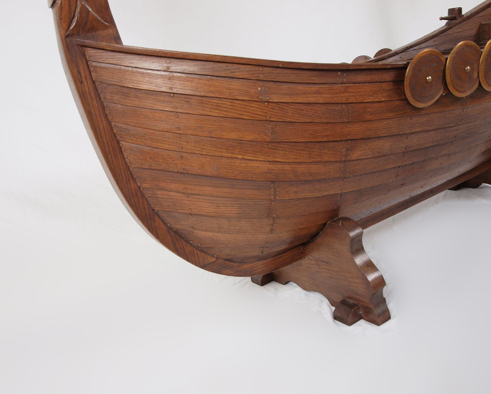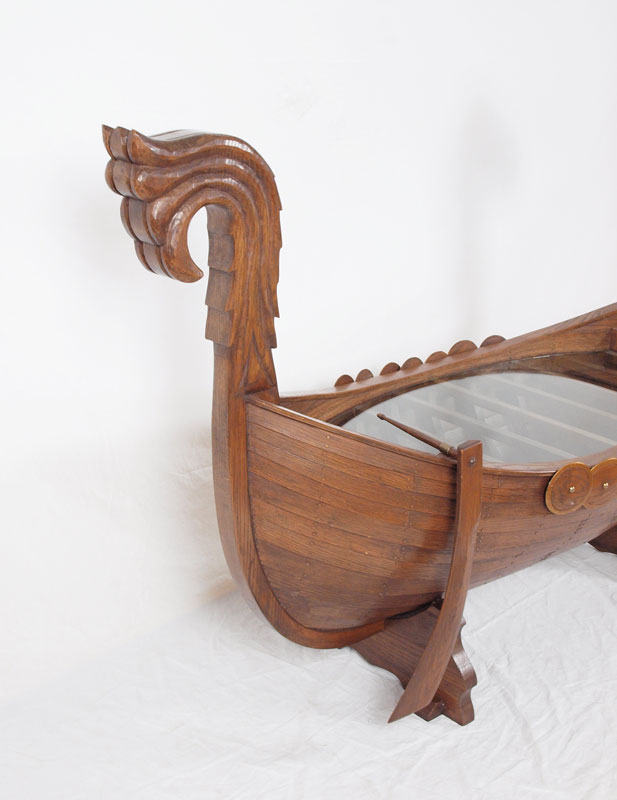 HAND CRAFTED MODEL OF A VIKING SHIP: Unique coffee table in the form of a Viking ship with glass top on wood stand. 44'' h. x 67'' x 22 1/2''.