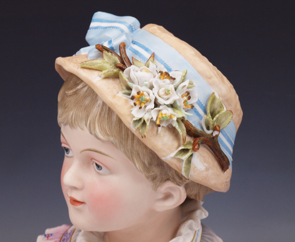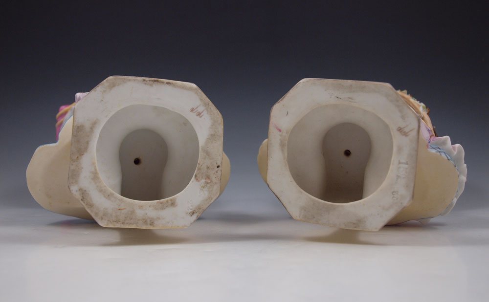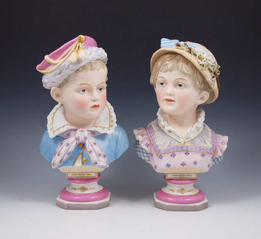 PAIR HIGH QUALITY BISQUE FIGURAL BUSTS: Young man and girl, applied decoration. Approx. 10 1/2''h. x 6'' x 4''