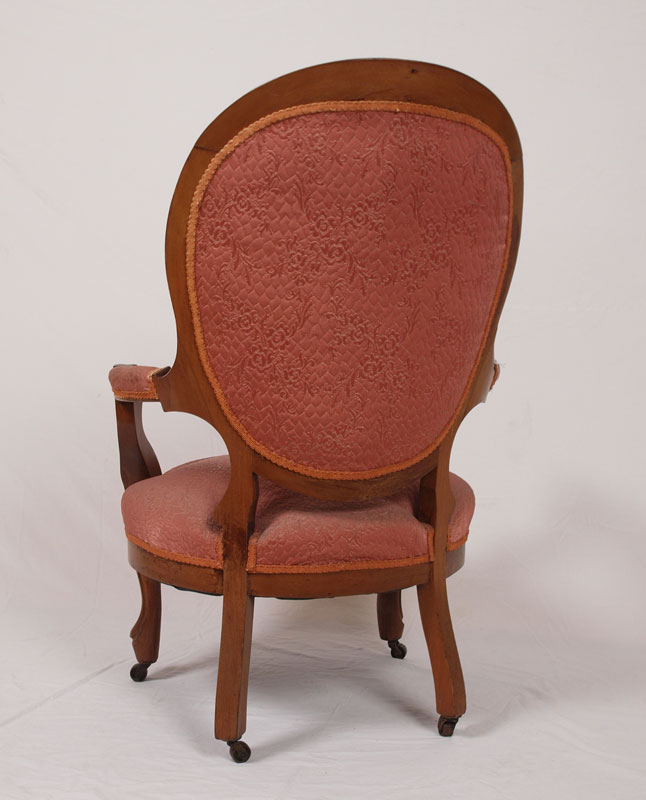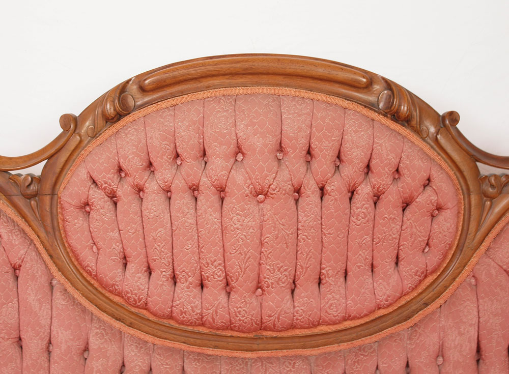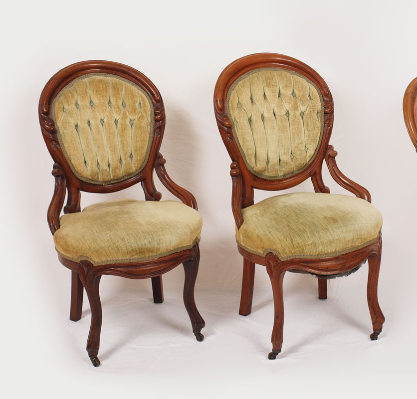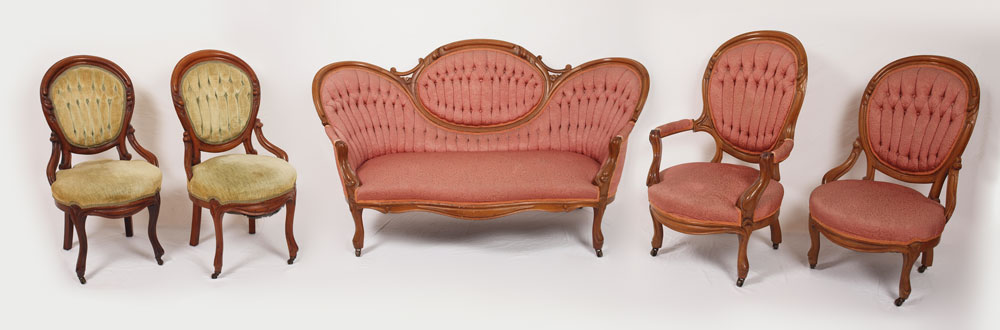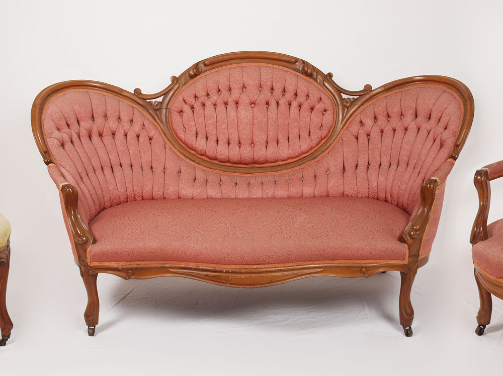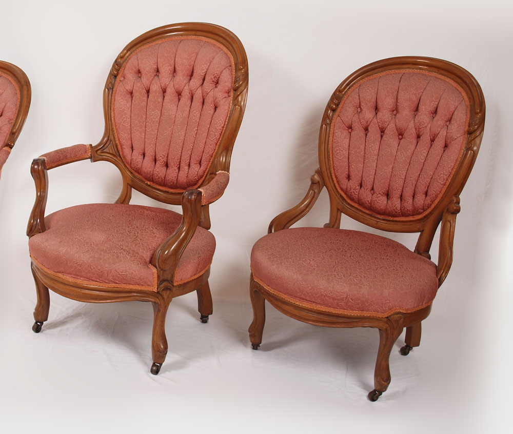 5 PIECE VICTORIAN WALNUT UPHOLSTERED PARLOR SET: Quality carved walnut frame with tufted seats and back. Sofa with central oval design and classic French foot. Sofa 41'' '' x 70'' x 33'', largest arm chair 42 1/2'' x 27'' x 30 1/2''.