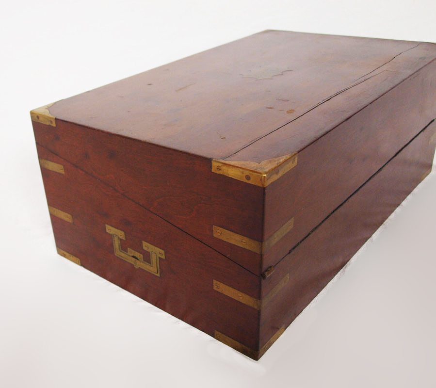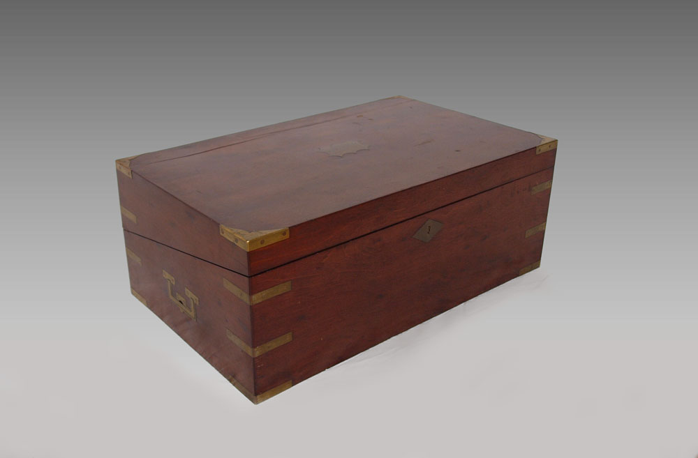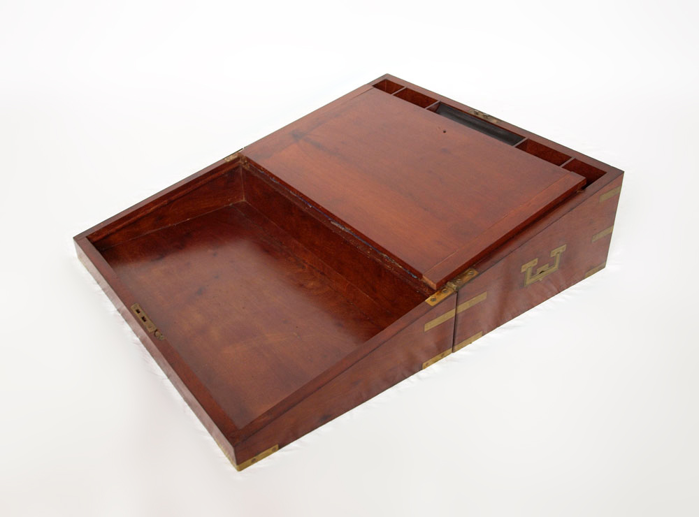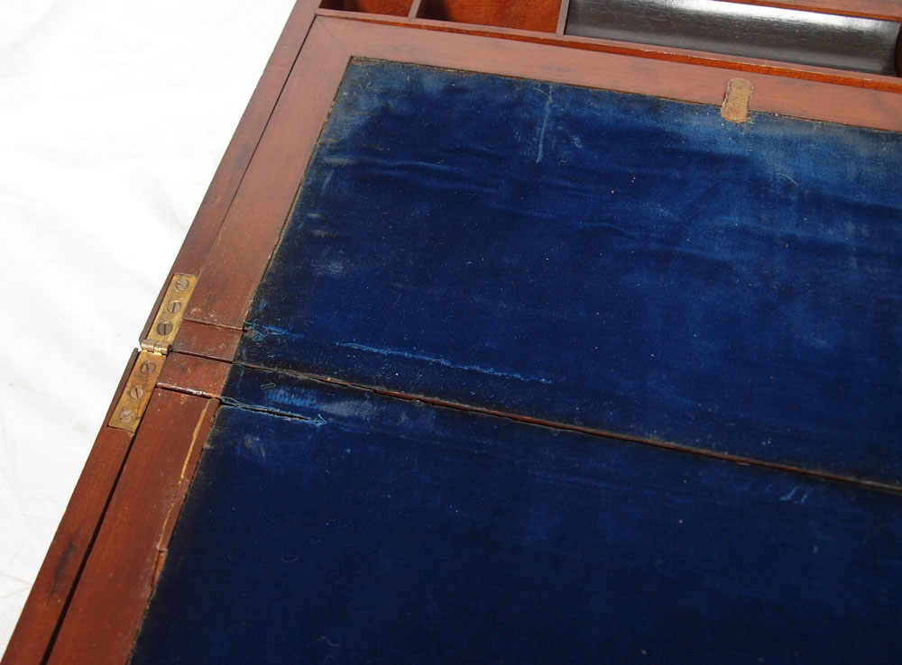 VICTORIAN LAP DESK: Mahogany with brass hardware, blue velvet interior. No key. 7 1/2'' x 19 1/2'' x 11 3/4''