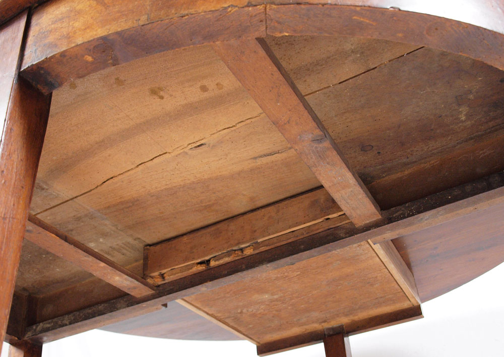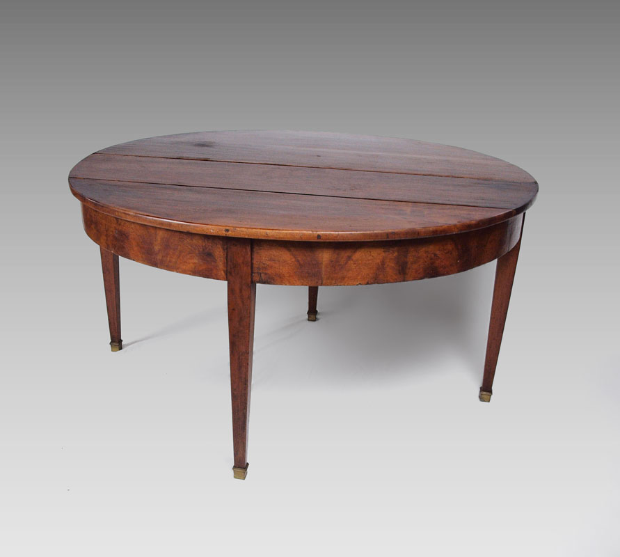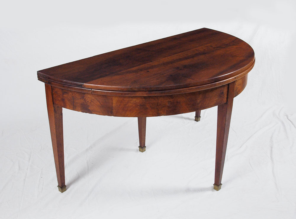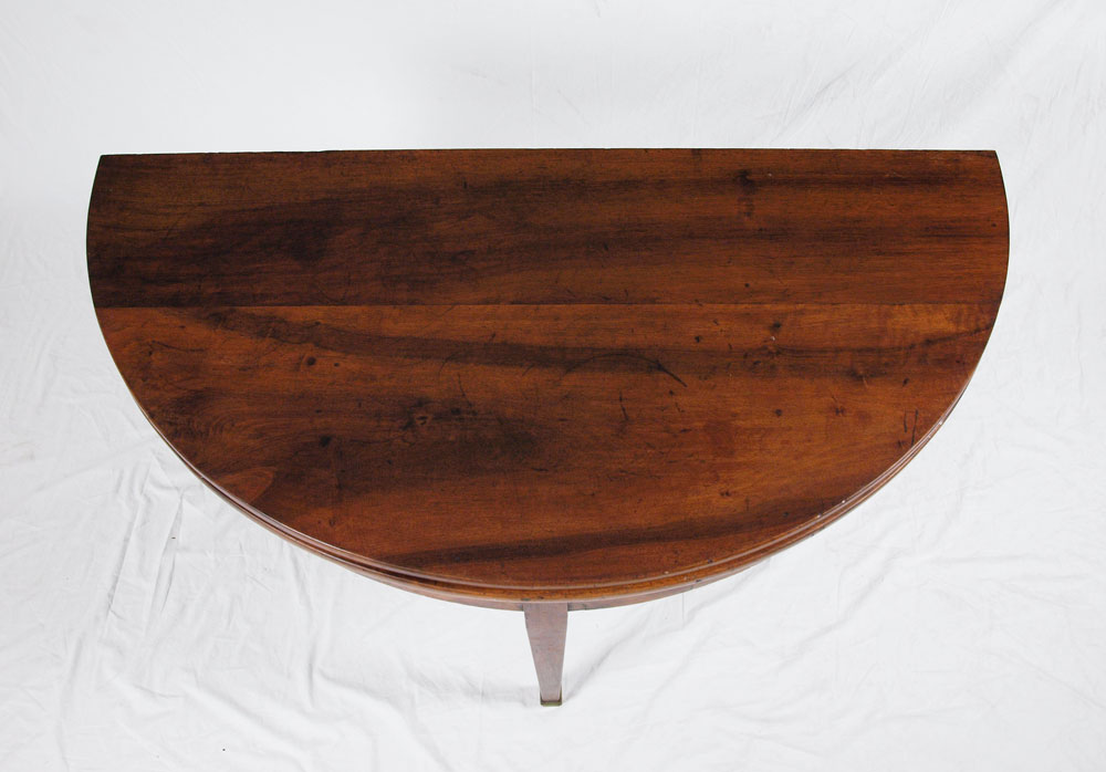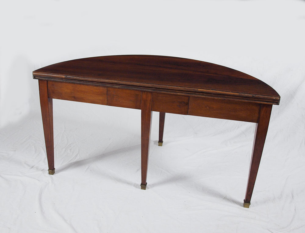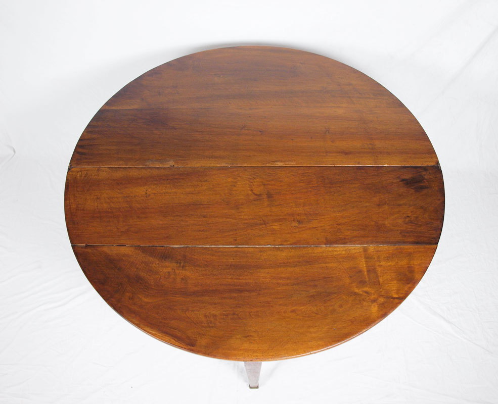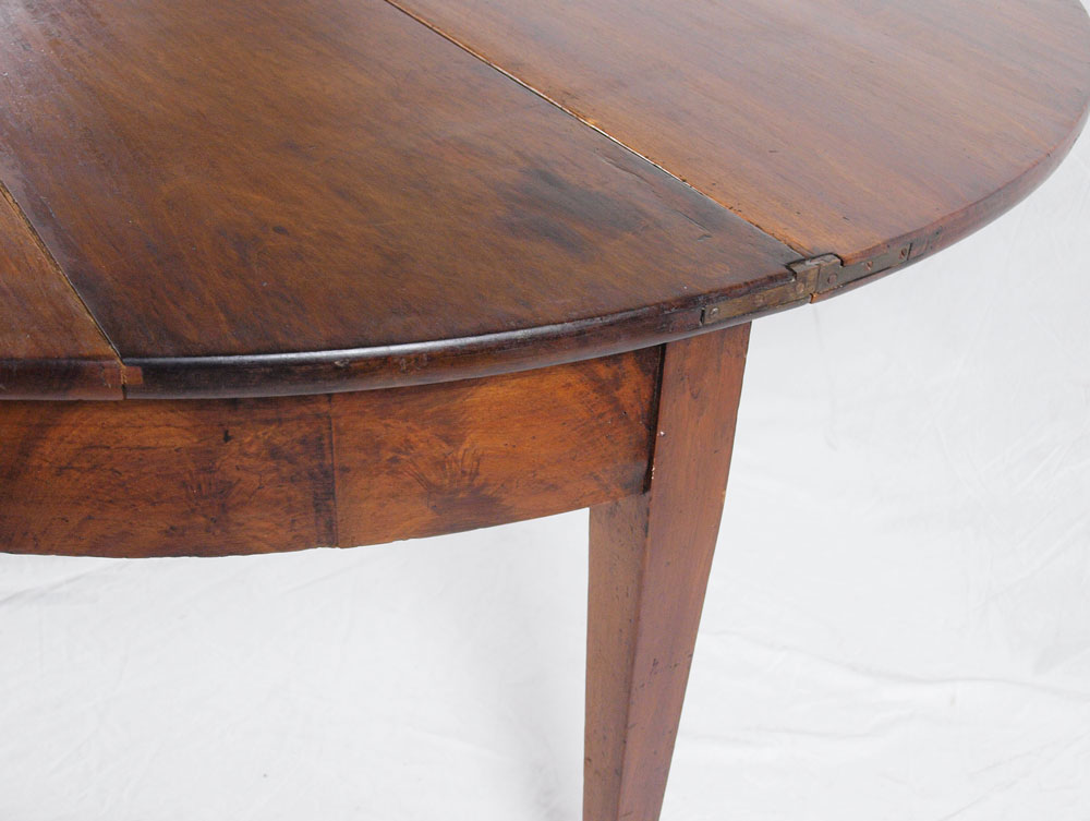 19th C. ROUND TABLE: D shaped table when closed. The top flips and the support (secret drawer slides. 28''h., 27''w., 54'' diam when open.
